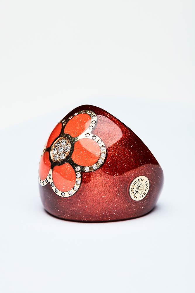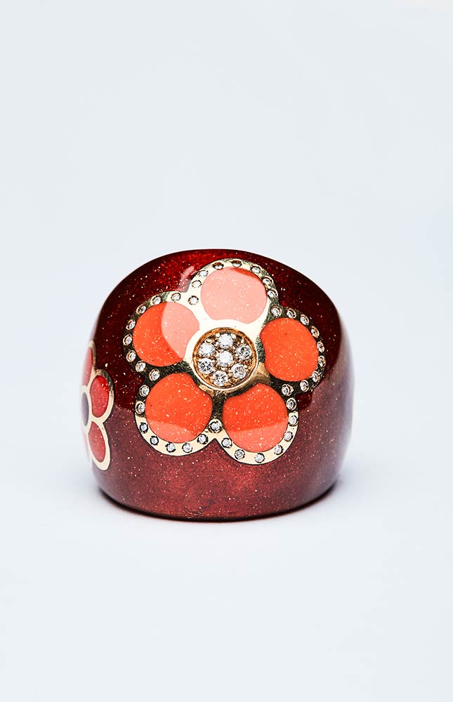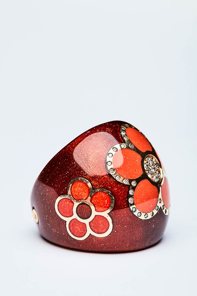 Anello realizzato in Italia negli anni ’80 in oro giallo K 18 e smalto. A fascia graduata, l'anello è decorato con fiori, quello centrale impreziosito da brillanti di 0,80 ct. Misura IT 20, 27,6x28,2 mm; peso 27 gr.