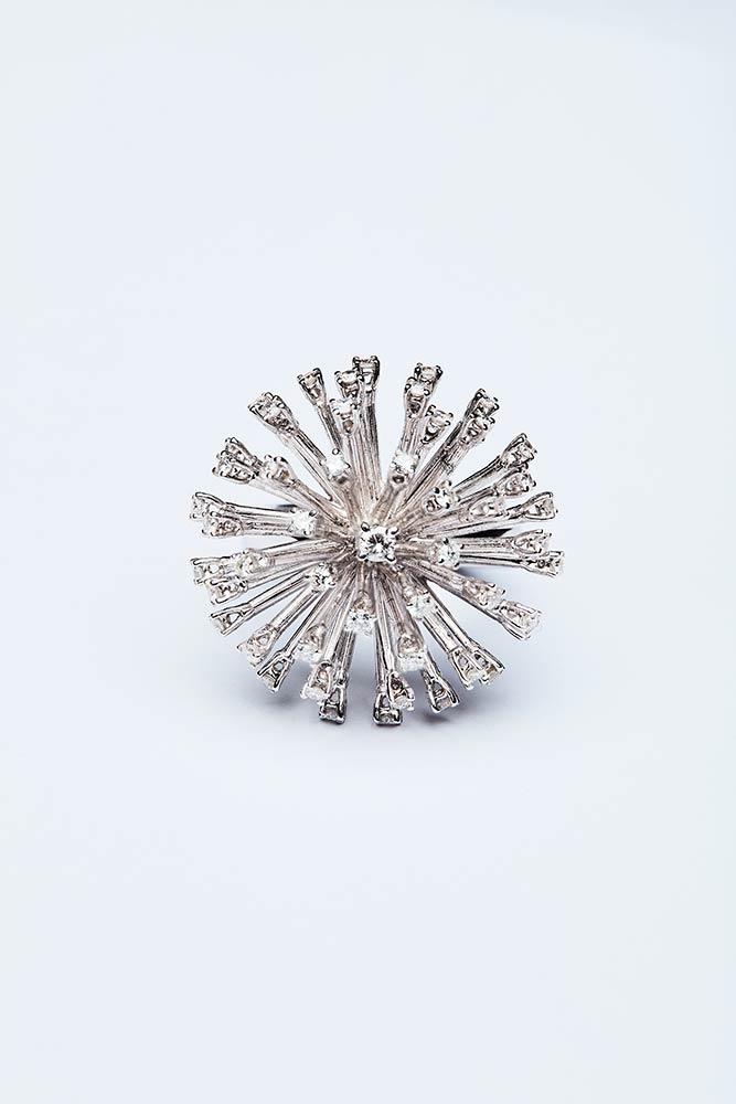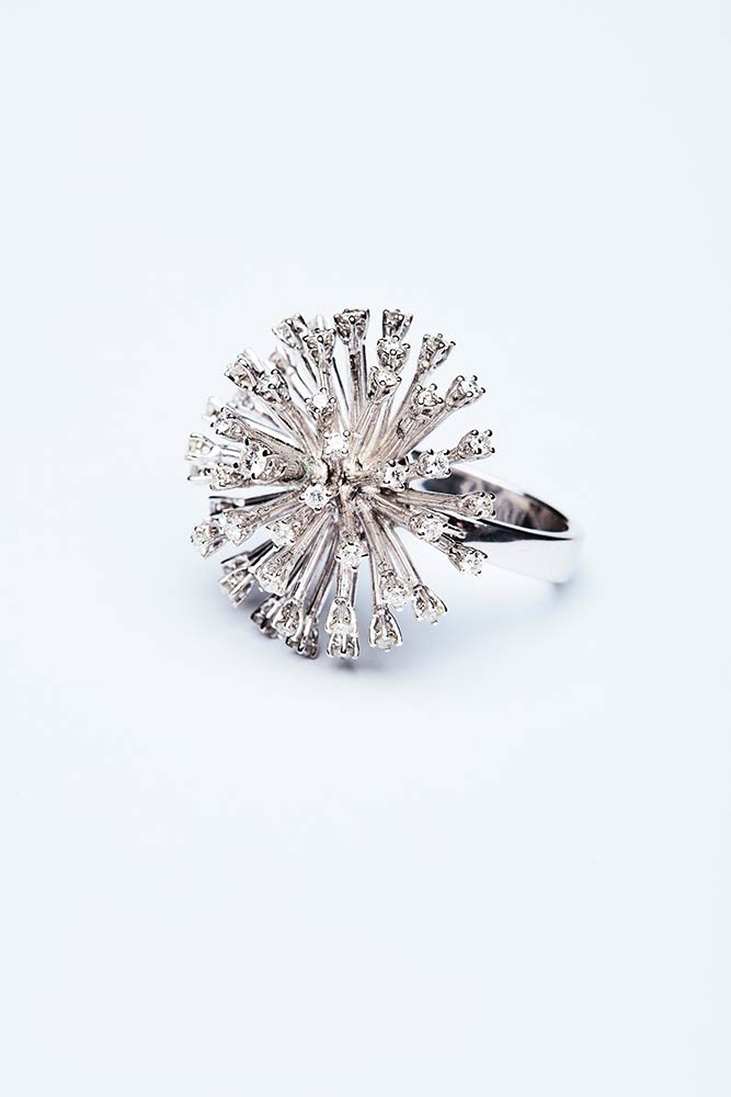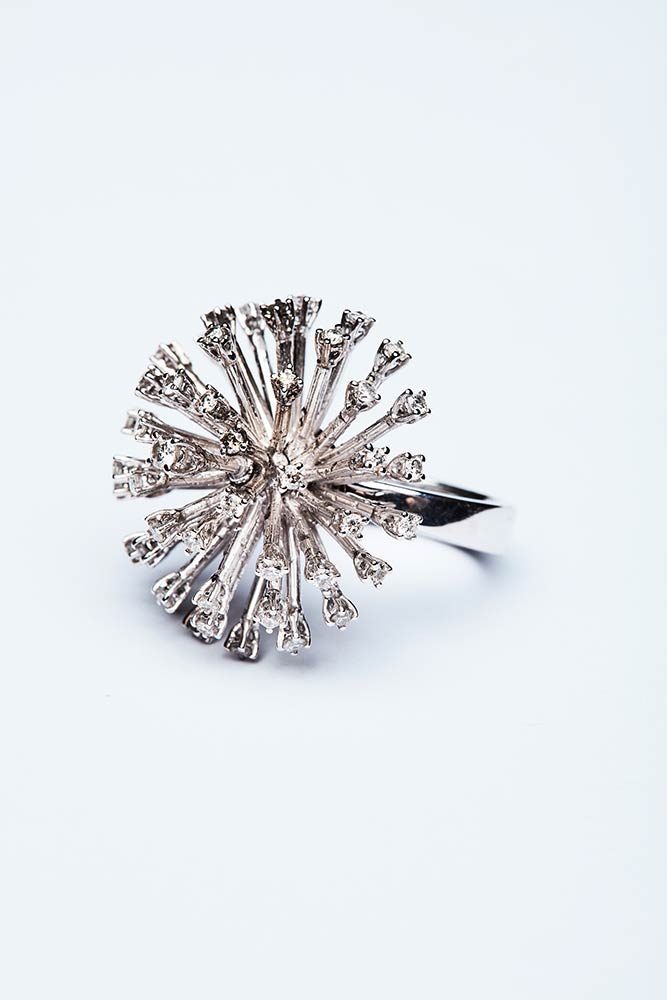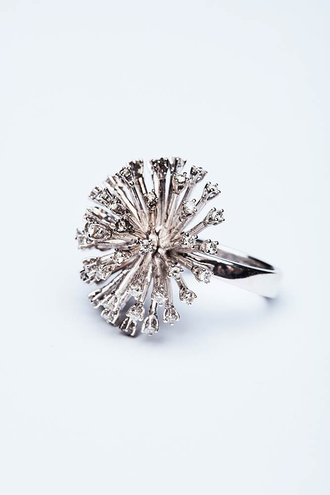 Anello artigianale realizzato in Italia negli anni '70 in oro bianco K 18 e brillanti di 0,9 ct a formare un soffione (taraxacum officinale). Tipico fiore associato all'azione di esprimere un desiderio. Misura IT 14, 26,3x15,85 mm. Peso 14 gr.