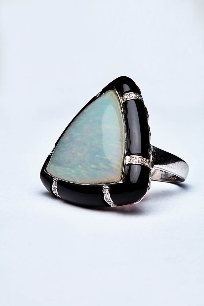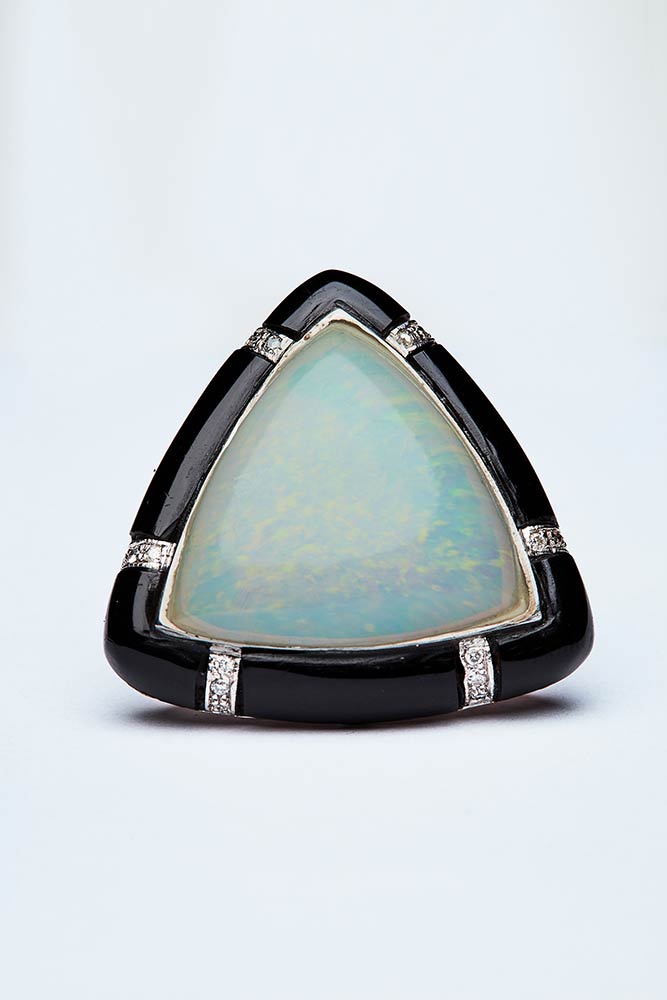Anello artigianale realizzato in Italia nel periodo decò in oro bianco K 18 con opale centrale incorniciato da segmenti di onice alternati da brillanti di 0,30 ct. Misura IT 17, 35,6x16,53 mm; peso 21,05 gr.