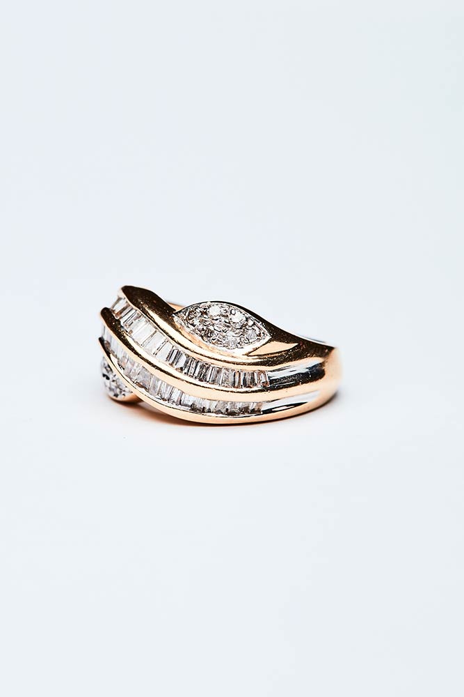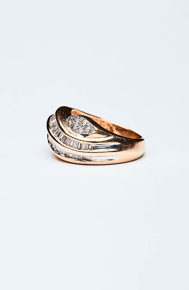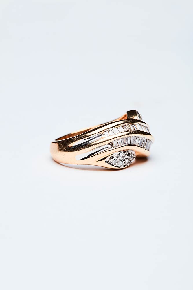 Anello artigianale realizzato in Italia negli anni '30 in oro giallo e bianco K 14. A forma di due serpenti stilizzati arrotolati, entrambi presentano il corpo di diamanti trapezoidali taglio "trapered" e testa in brillanti per un totale di 1 ct. Misura IT 14,5, 11,5x23 mm; peso 8,18 gr.