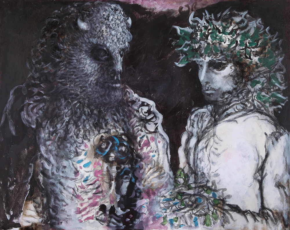ARTURO CARMASSI Lucca 02/07/1925 III studio per "Minosse, l'oracolo e il minotauro", 1969 olio su tela cm. 73x91, firma, titolo e anno al retro, dichiarazione d'autenticità dell'artista su foto.