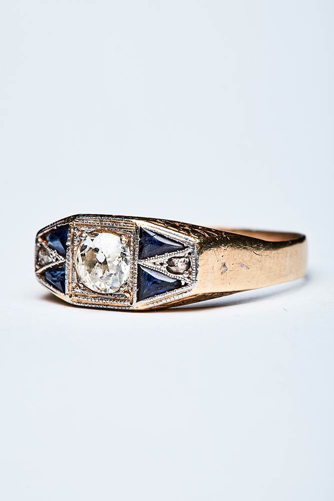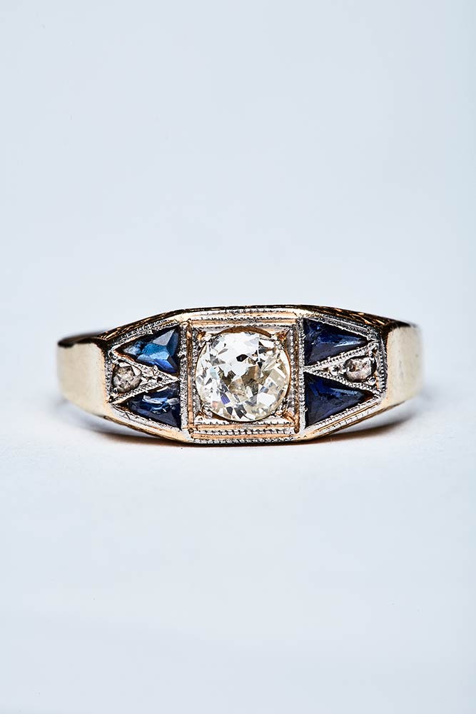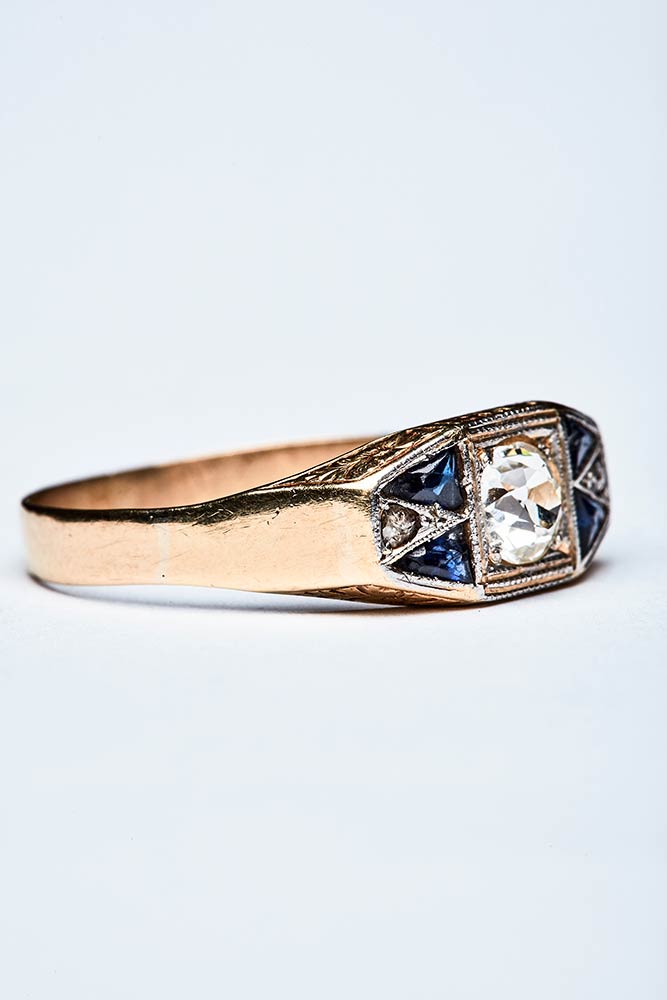Anello artigianale realizzato in Italia nel periodo decò in oro giallo e bianco K 18. La parte centrale composta da varie forme geometriche, è impreziosita da diamanti mezzo taglio di 0,70 ct e zaffiri triangolari di 0,20 ct. Misura IT 27, 7,95x17,64 mm; peso 3,79 gr.