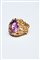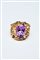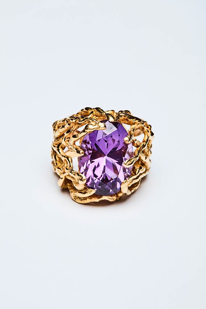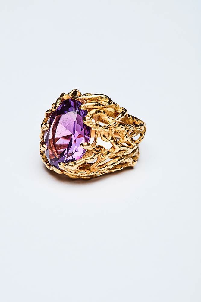Anello artigianale realizzato in Italia negli anni '70 in oro giallo K 18. Dalla forma insolita, l'anello presenta un' ametista ovale centrale di 30 ct avvolta da segmenti di oro che ricordano dei rami. Misura IT 19, 22,8x24,4 mm; peso 18,53 gr.