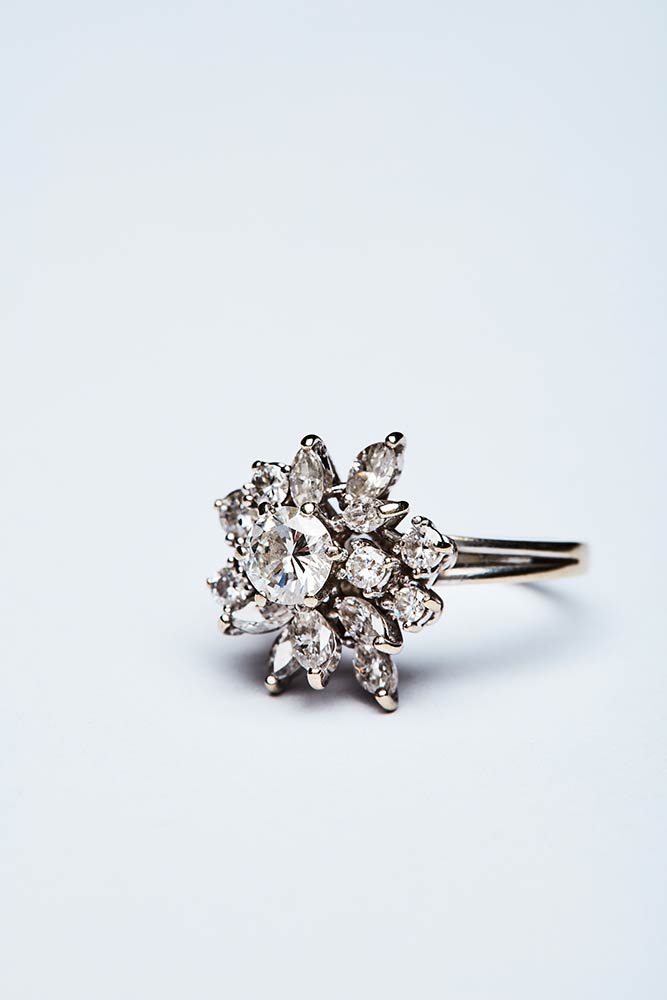 Anello artigianale realizzato in Italia negli anni '20 in oro bianco K 18 e diamanti a formare un fiore: Brillante centrale 0,50 ct, diamanti navette 0,50 ct e brillanti 0,35 ct. Misura IT 11, 15,6 mm; peso 5,16 gr.