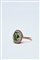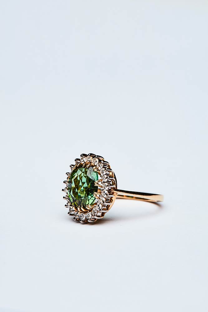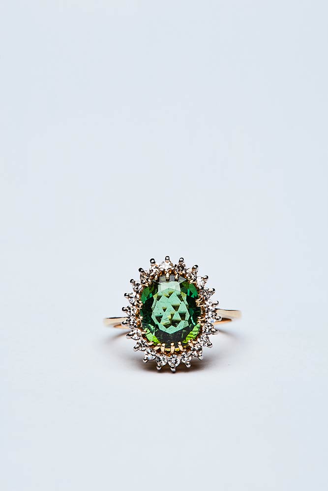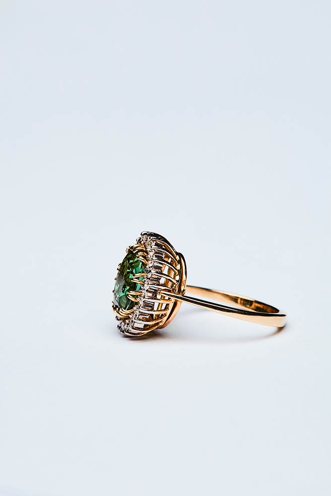 Anello artigianale realizzato in Italia negli anni '80 in oro giallo e bianco K 18. Peridoto centrale di 5 ct contornato da brillanti di 0,50 ct. La forma dell'anello ricorda un cardo. Misura IT 14, 16,3x14 mm; peso 5,7 gr.