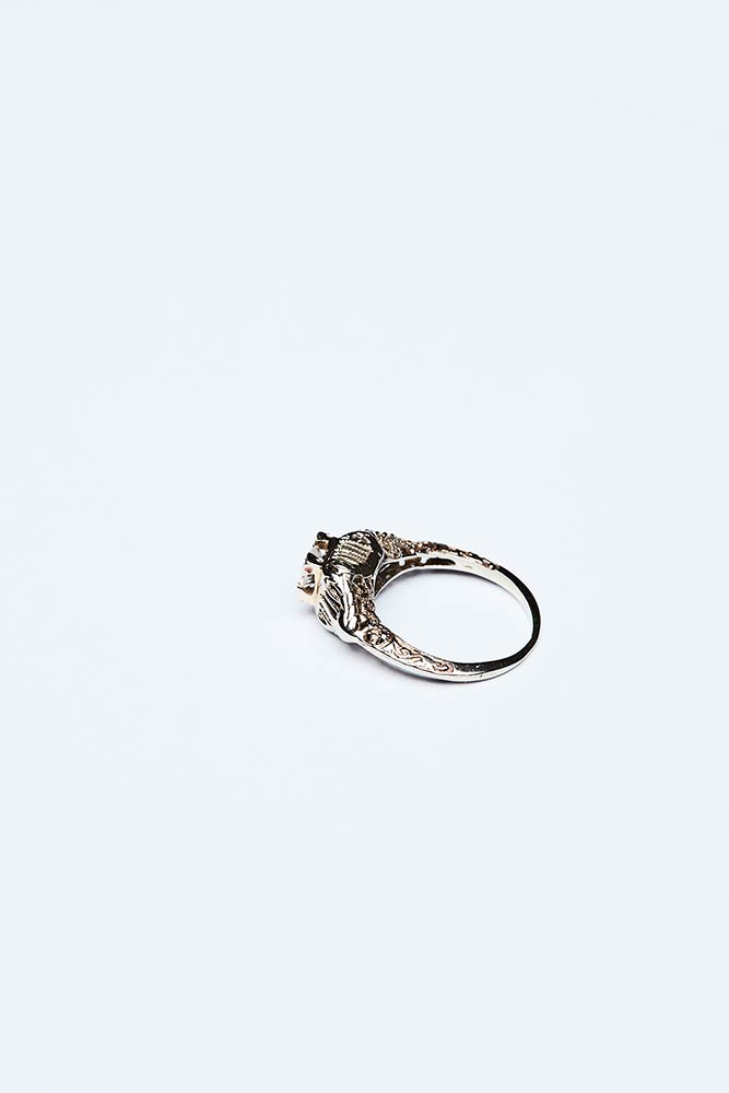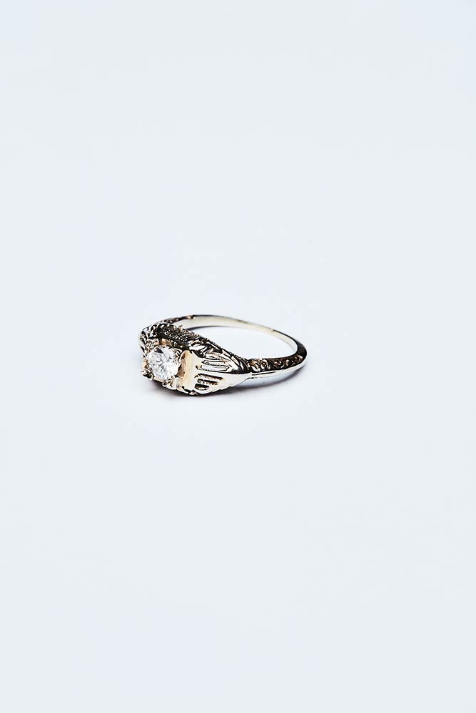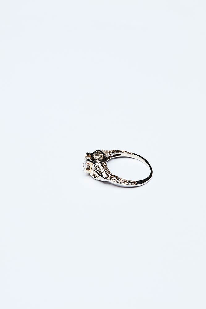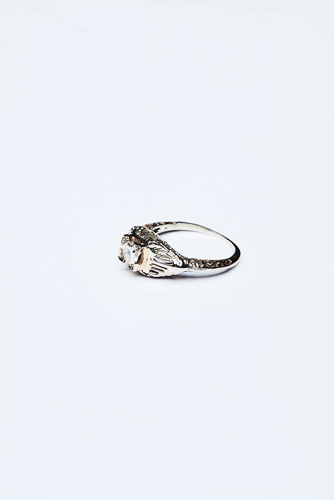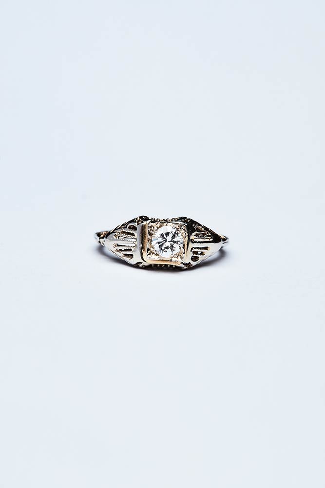 Anello artigianale realizzato in Italia negli anni '20 in oro bianco e giallo K 18 con brillante centrale di 0,30 ct colore G-I. Il gambo decorato a motivi vegetali incisi. Misura IT 8,5; peso 2,18 gr.