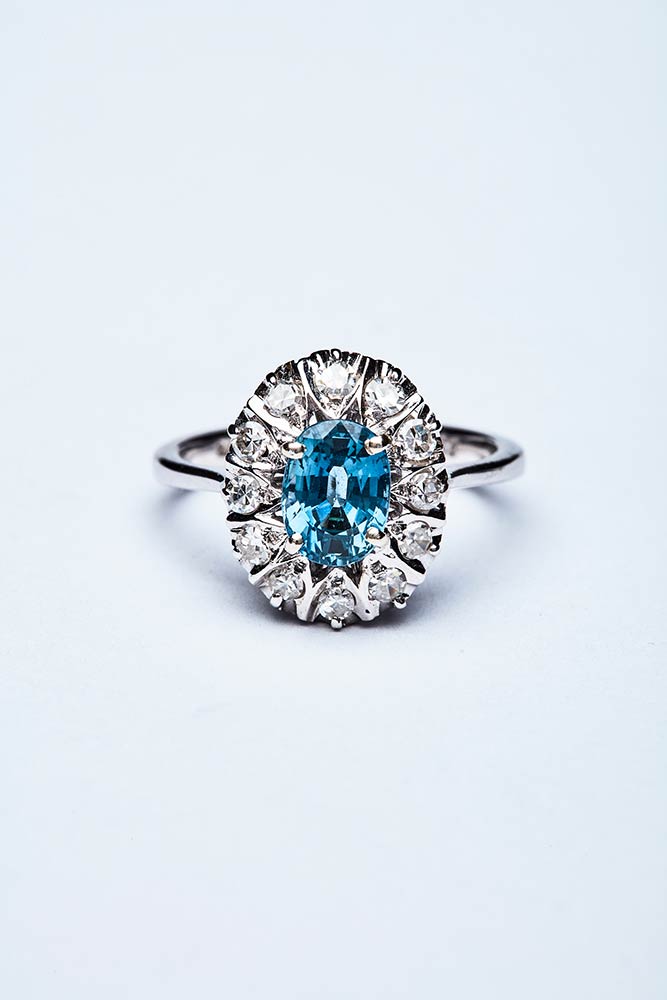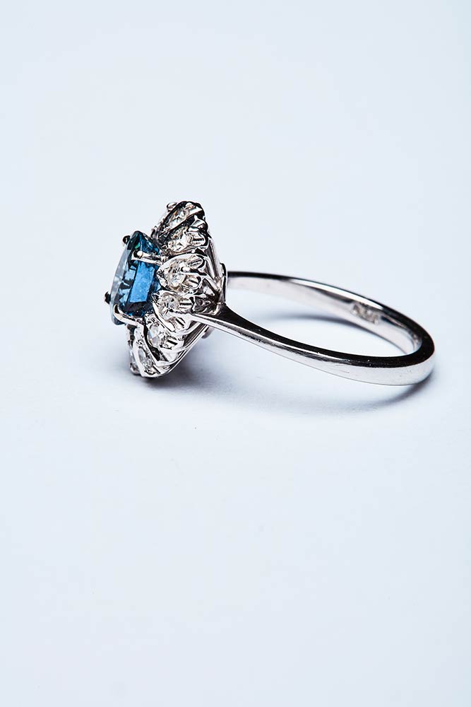 Anello artigianale realizzato in Italia negli anni '40 in oro bianco K 18. Zaffiro ceylon ovale di 1,39 ct contornato da brillanti di 0,50 ct. Misure IT 9,5, 13,68x12,12 mm; peso 4 gr.