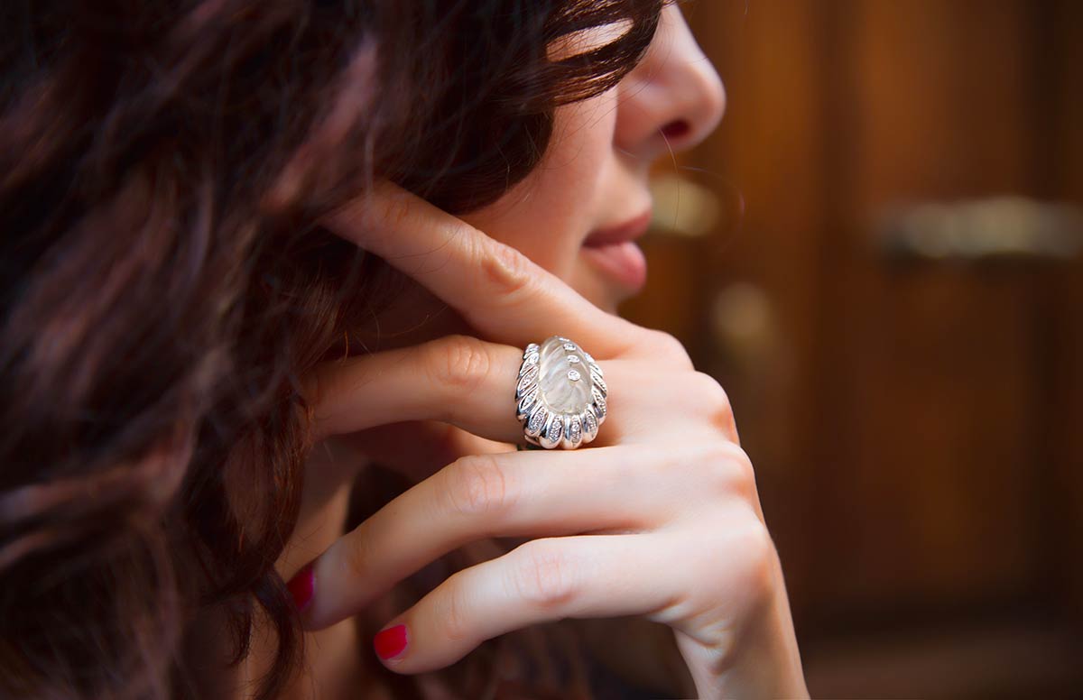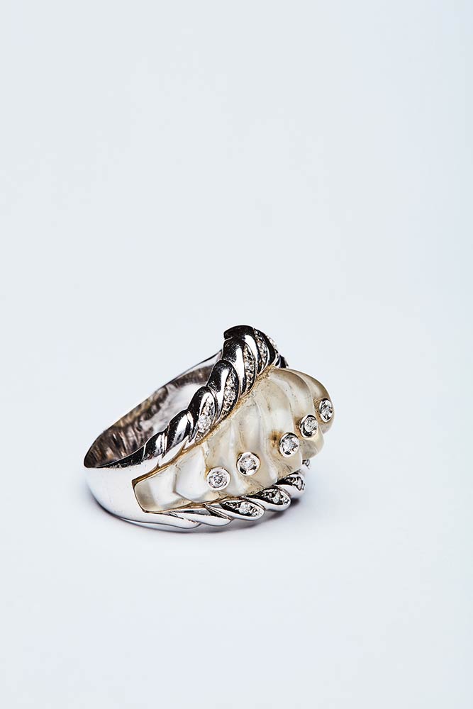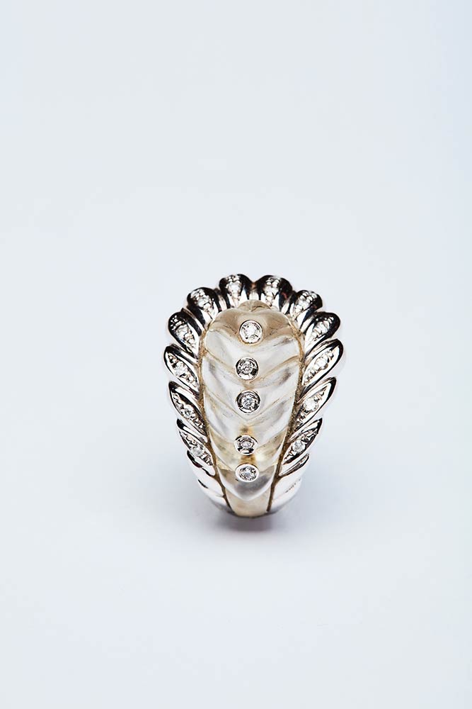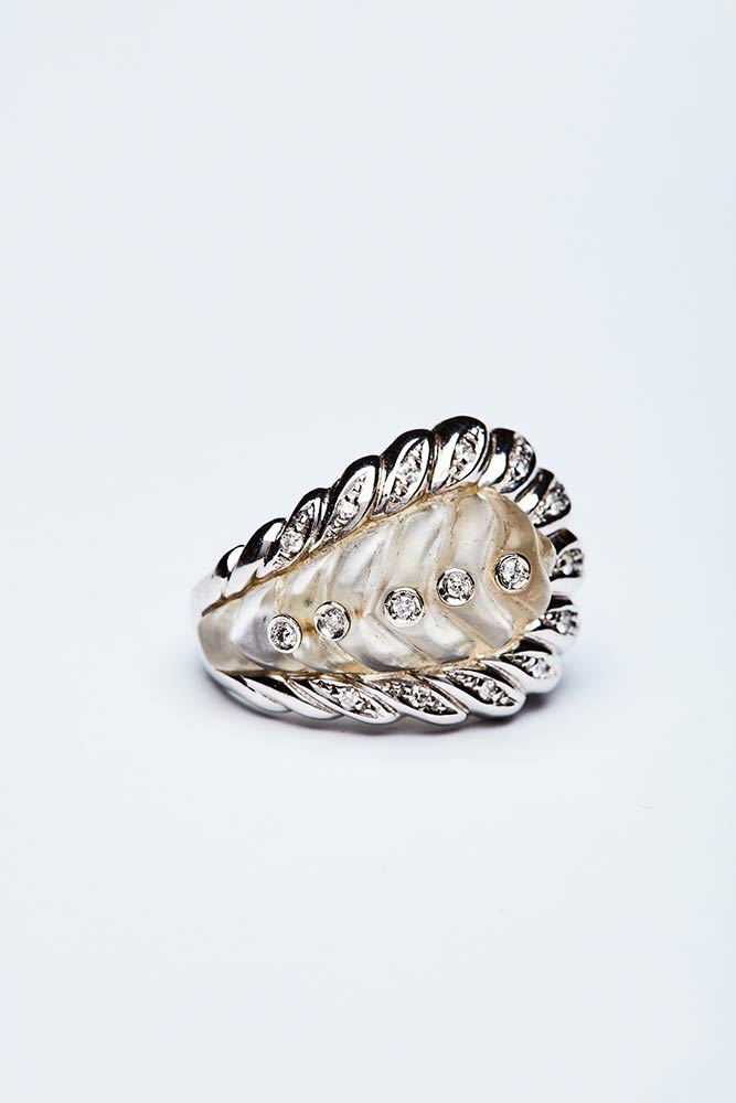 Anello artigianale realizzato in Italia nel periodo liberty in oro bianco K 18. Cristallo di rocca centrale inciso ed impreziosito da brillanti, affiancato da fogliette in oro bianco con incastonati brillanti per un totale di 1,20 ct. Misura IT 17, 19,7x26 mm; peso 10,56 gr.