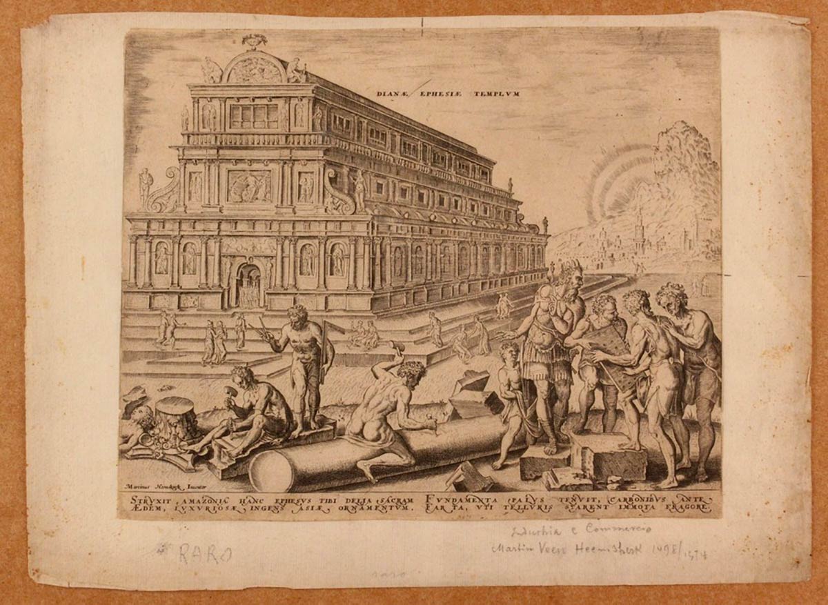 Il Tempio di Diana ad Efeso [allegoria dell'industria e del commercio], 1580 circa - serie Le Sette Meraviglie del Mond0; incisione a bulino di Philippe Galle (1537-1612) da Maerten van Heemskerck (1498 - 1574) stampata ad Anversa nel 1580 circa