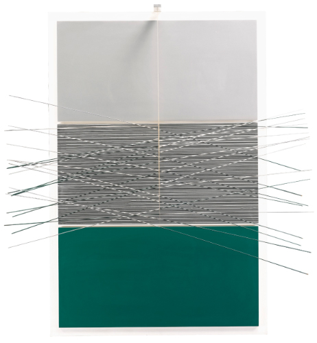 JESUS RAFAEL SOTO N. 1923 OLIVA E ARGENTO signed and dated 1969 on the reverse, acrylic on board, painted metal and nylon. This work is registered by Archive Soto, curated by Helène Soto, Paris, under n. 90622254 firmato e datato 1969 sul retro acrilico su tavola, metallo dipinto e fili di nylon cm 107x72 Opera registrata presso l'Archive Soto, a cura di Hélène Soto, Parigi, con il n. 90622254 PROVENANCE Marlborough Galleria d'Arte, Roma Ivi acquistato dalla famiglia dell'attuale proprietario nei primi anni Settanta