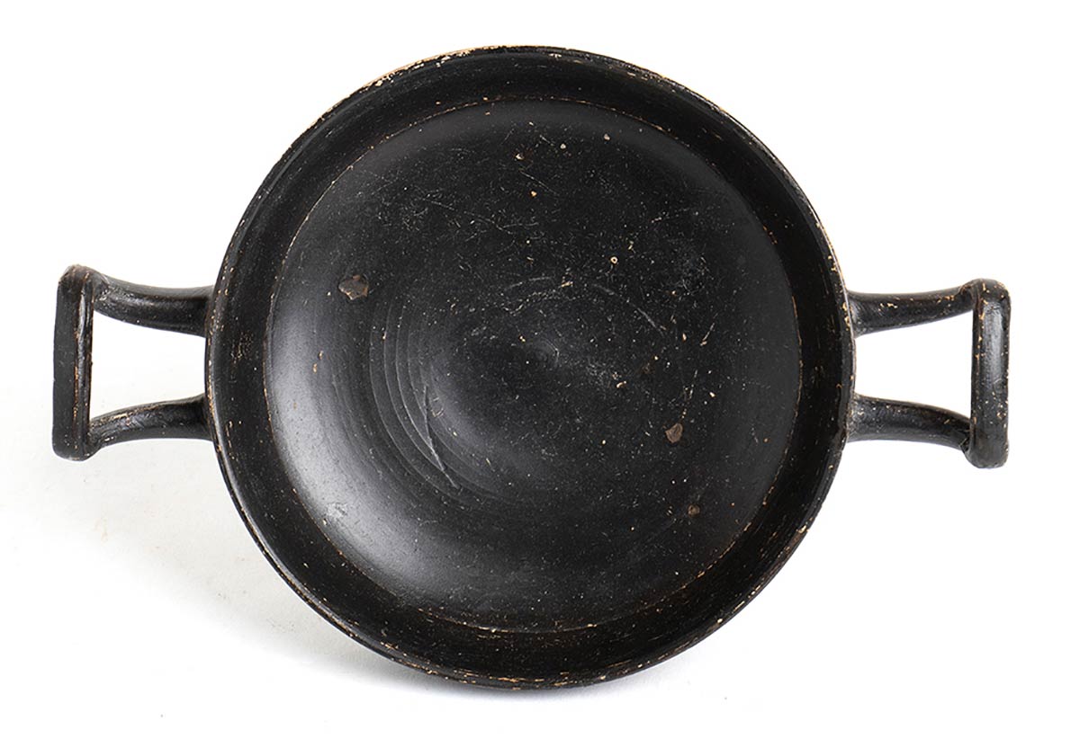 Apulian Black-Glazed Kylix, 4th - 3rd century BC; height cm 6, diam. cm 12. Provenance: English private collection, according to the heirs possibly purchased in some auction or Art Gallery during 1970s-1980s.