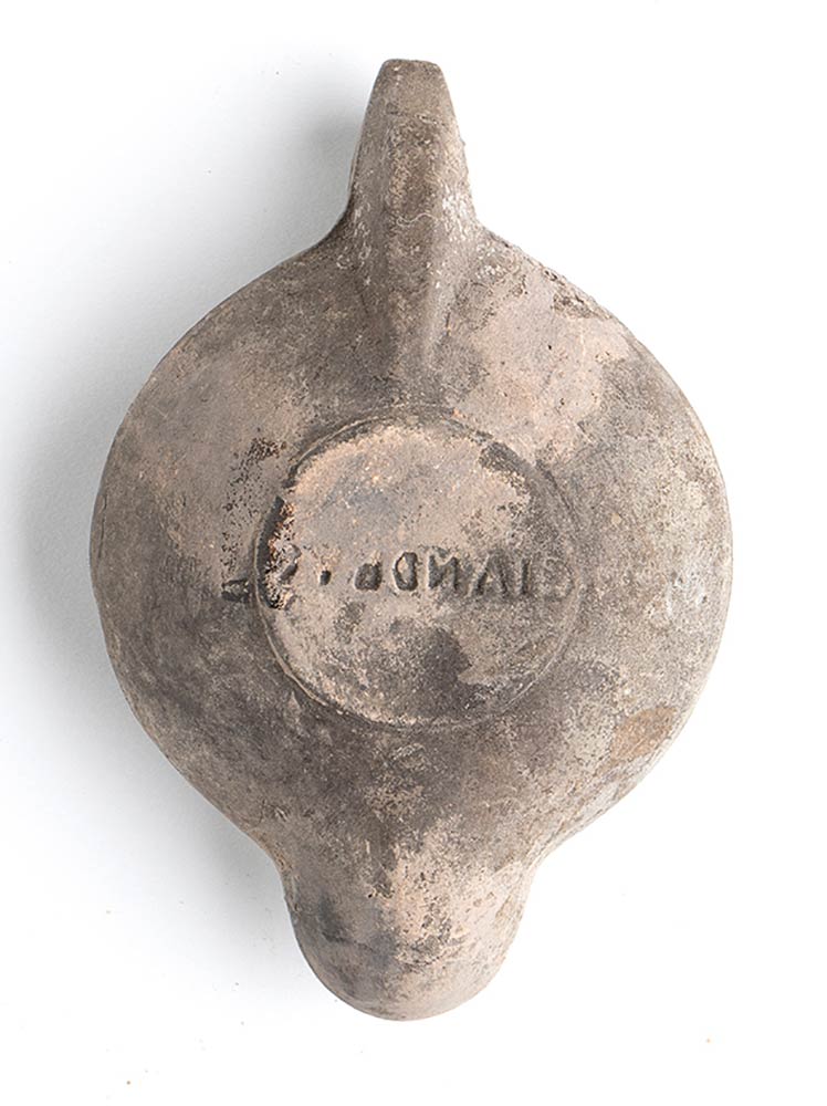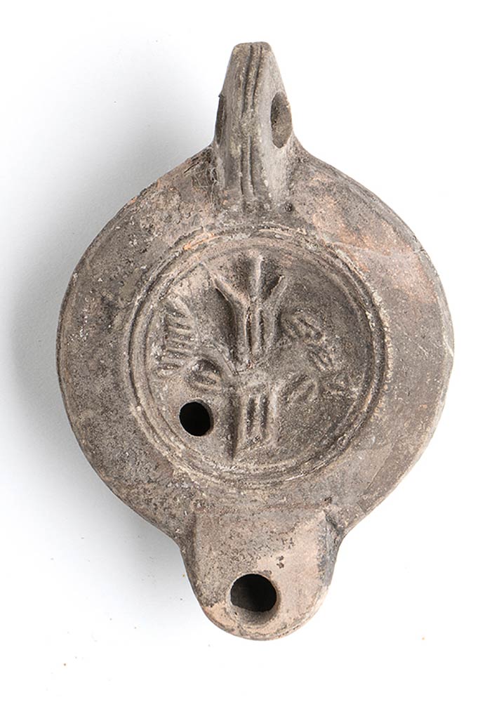 Roman Oil Lamp with Rudder and Fishes, 1st - 2nd century AD; height cm 4,5, length cm 11
