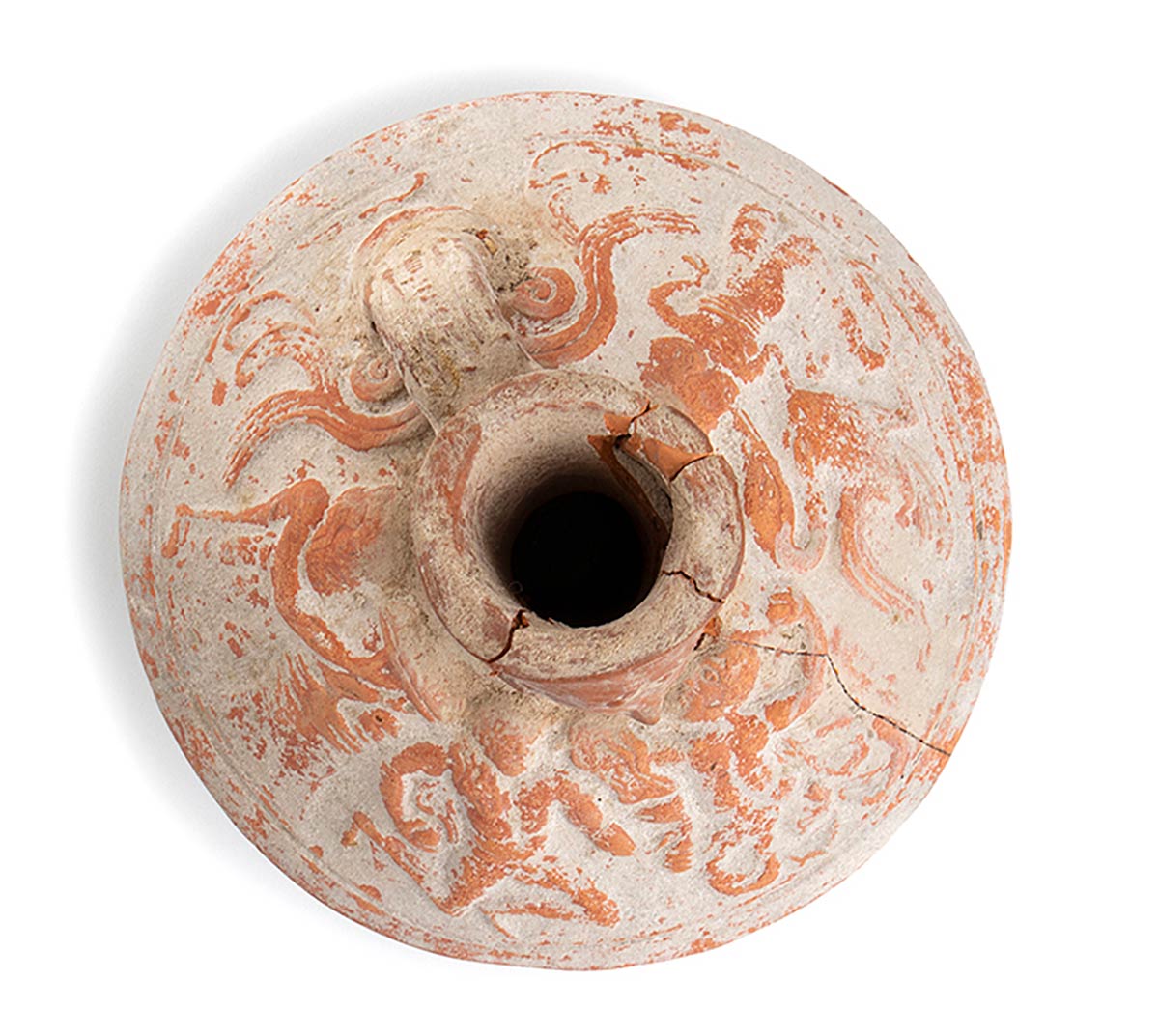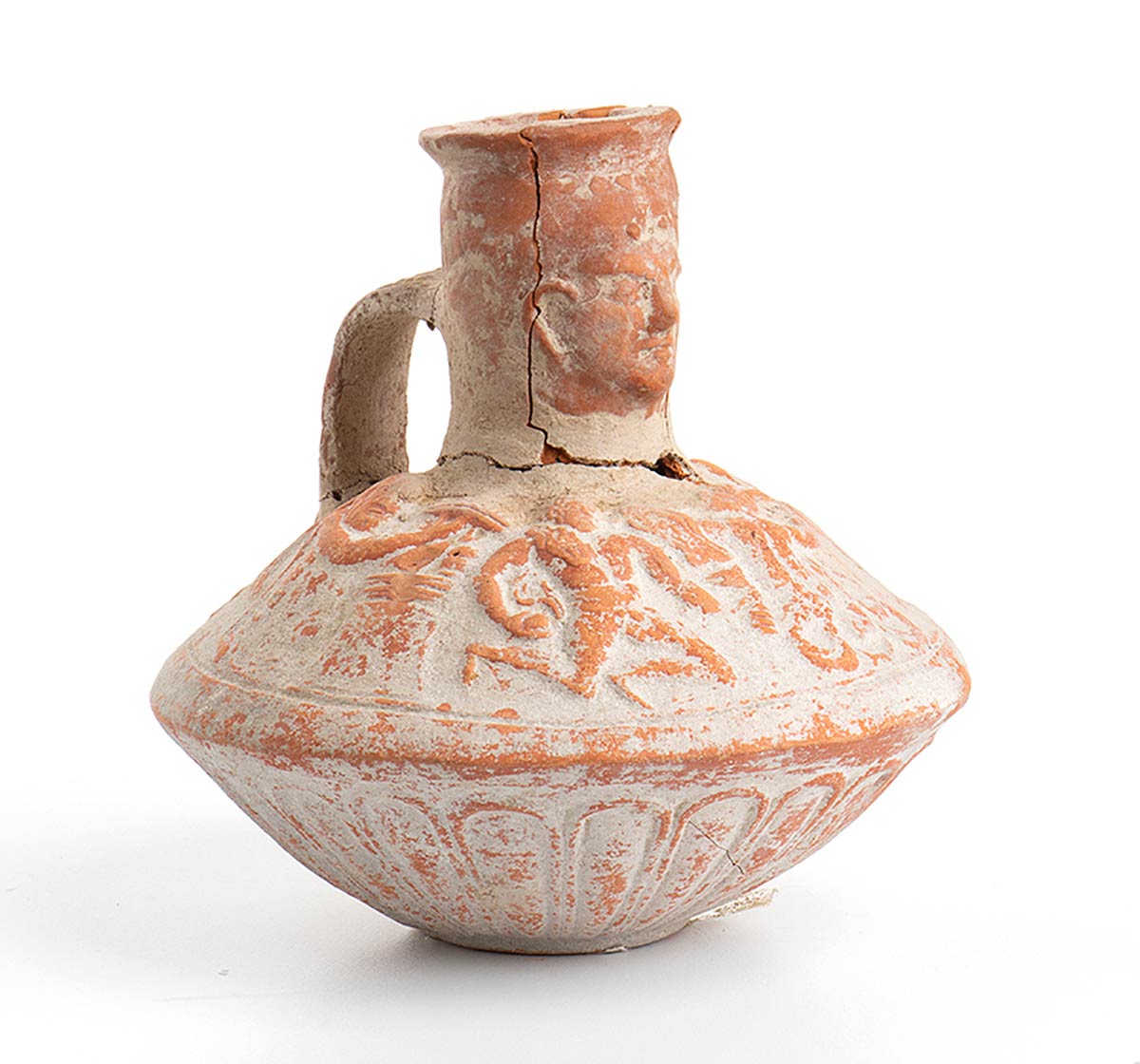 Roman African Lagynos with Plastical Decoration, 4th - 6th century AD; height cm 18; diam. cm 5,5; Characterized by a human head on the neck and by a sequence of figures on the upper section of the body. Fragmentary and restored. Provenance: From the collection of a Diplomatic family since 1980s.