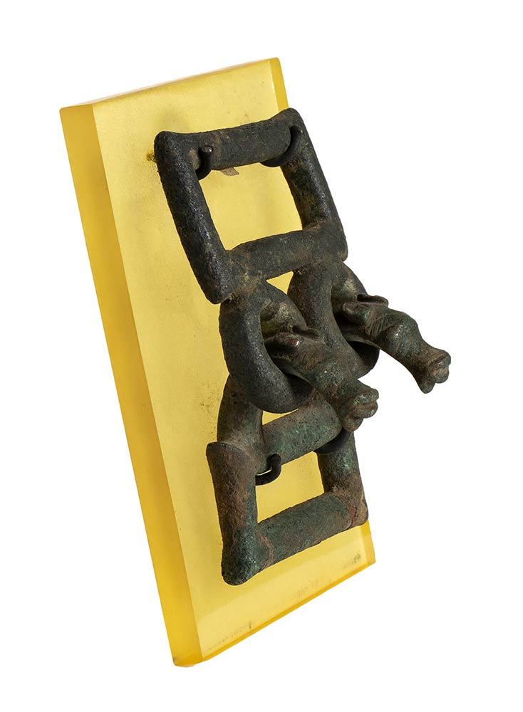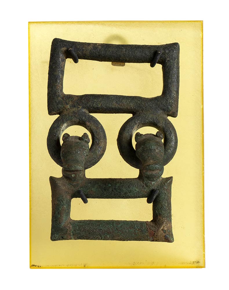 Etruscan Bronze Belt-Buckle, 6th - 5th century BC; height cm 12, length cm 8; plexiglass stand cm 15 x 10,5