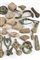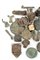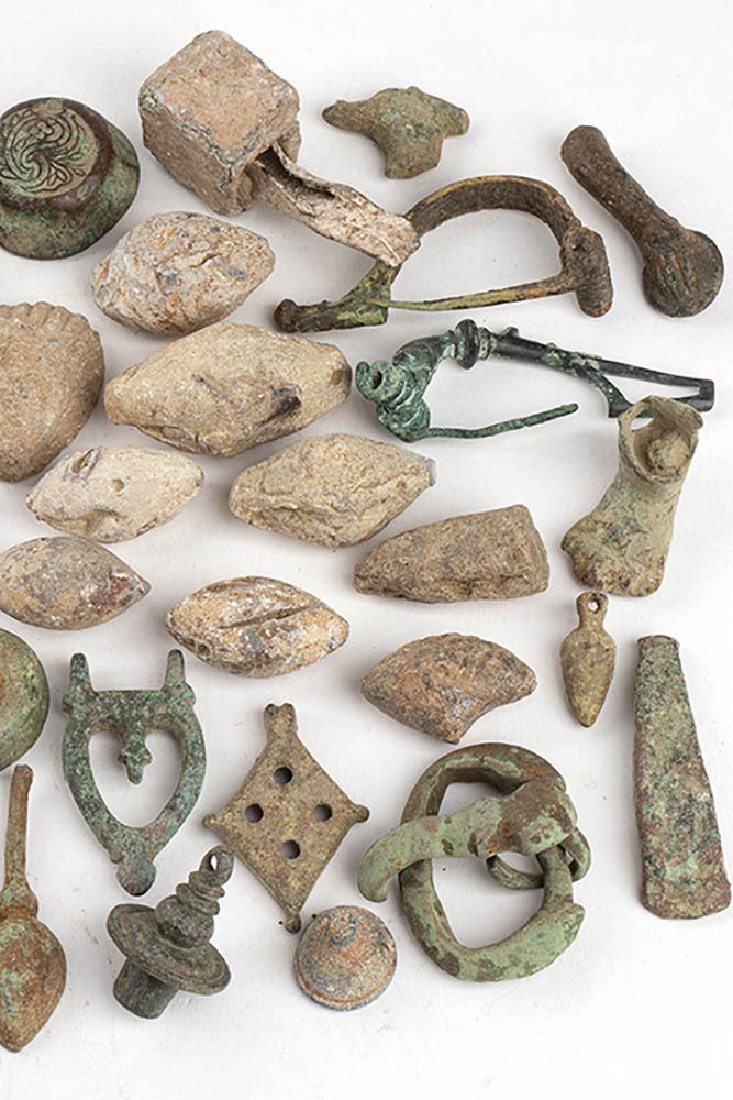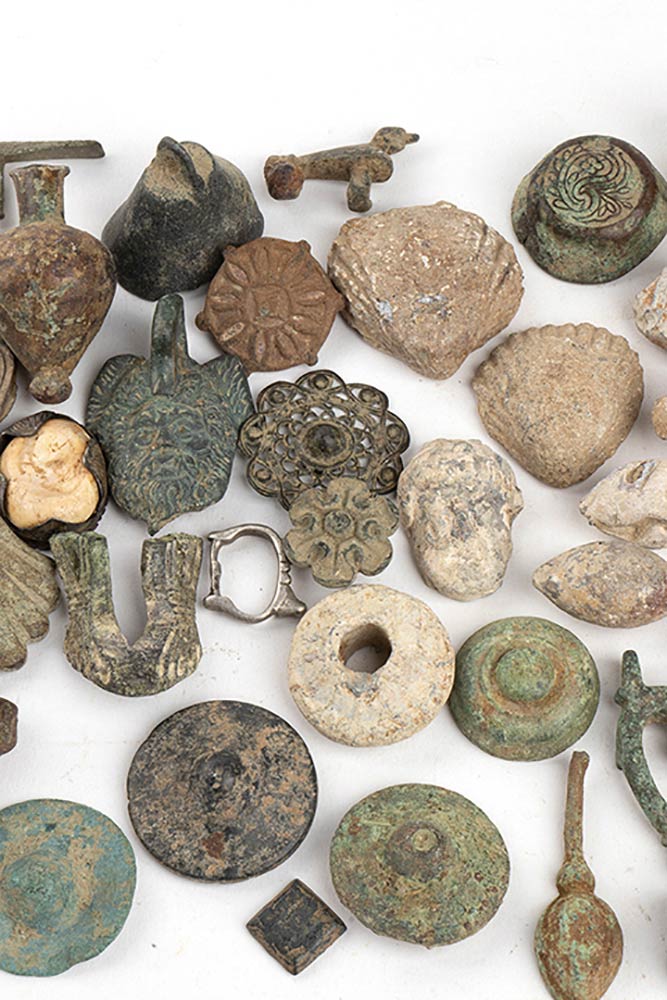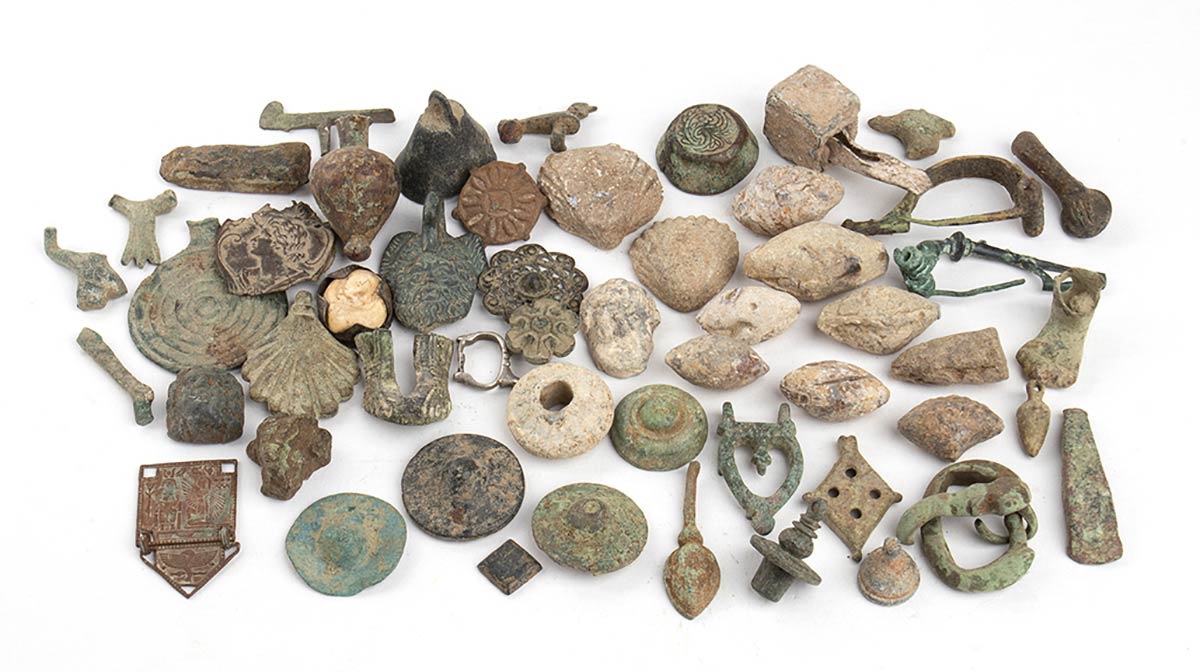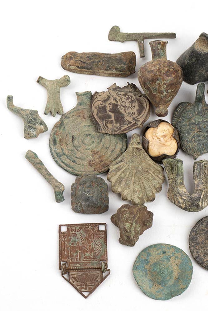 Group of Several Roman Bronze and Lead Items, from 3rd century BC; length max (fibula with needle) cm 5,3 - min (squared plaquette) cm 1. With pieces of bronze statuettes, various fibulae and bullae, lead sling-bulllets, etc... Provenance: English private collection, bought before 2000s.