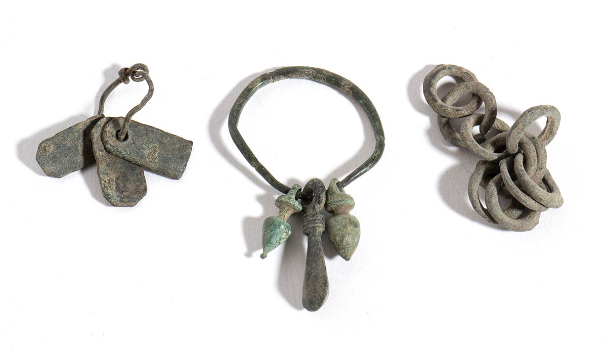 Group of Three Mostly Roman Bronze Decorative Elements, From 1st century BC; length max cm 4