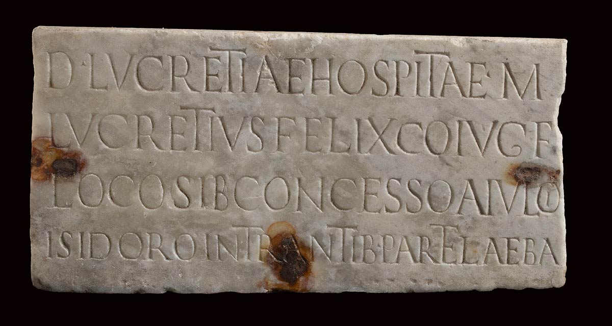 Roman Marble Gravestone of Lucreatia Hospita, 2nd - 3rd century AD; height cm 20; length cm 42; wide cm 2,5. Provenance: English private collection; said to have been given to him by an Iranian businesman in 1990s.