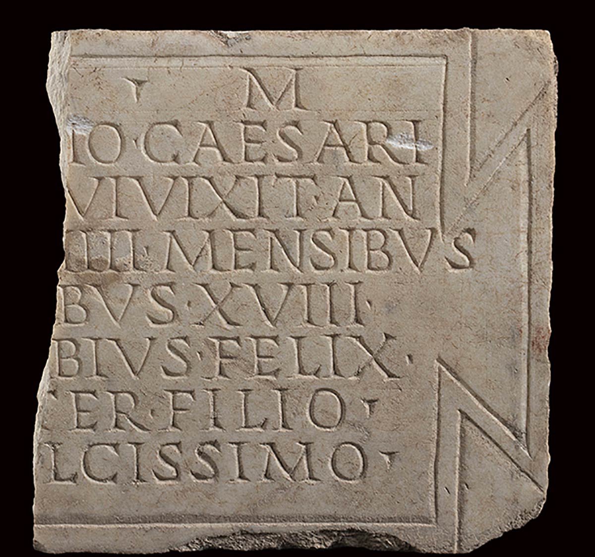 Roman Marble Funerary Inscription on Tabula Ansata, 1st - 2nd century AD; height cm 30,5 (with support); length cm 25,8; wide cm 3,5