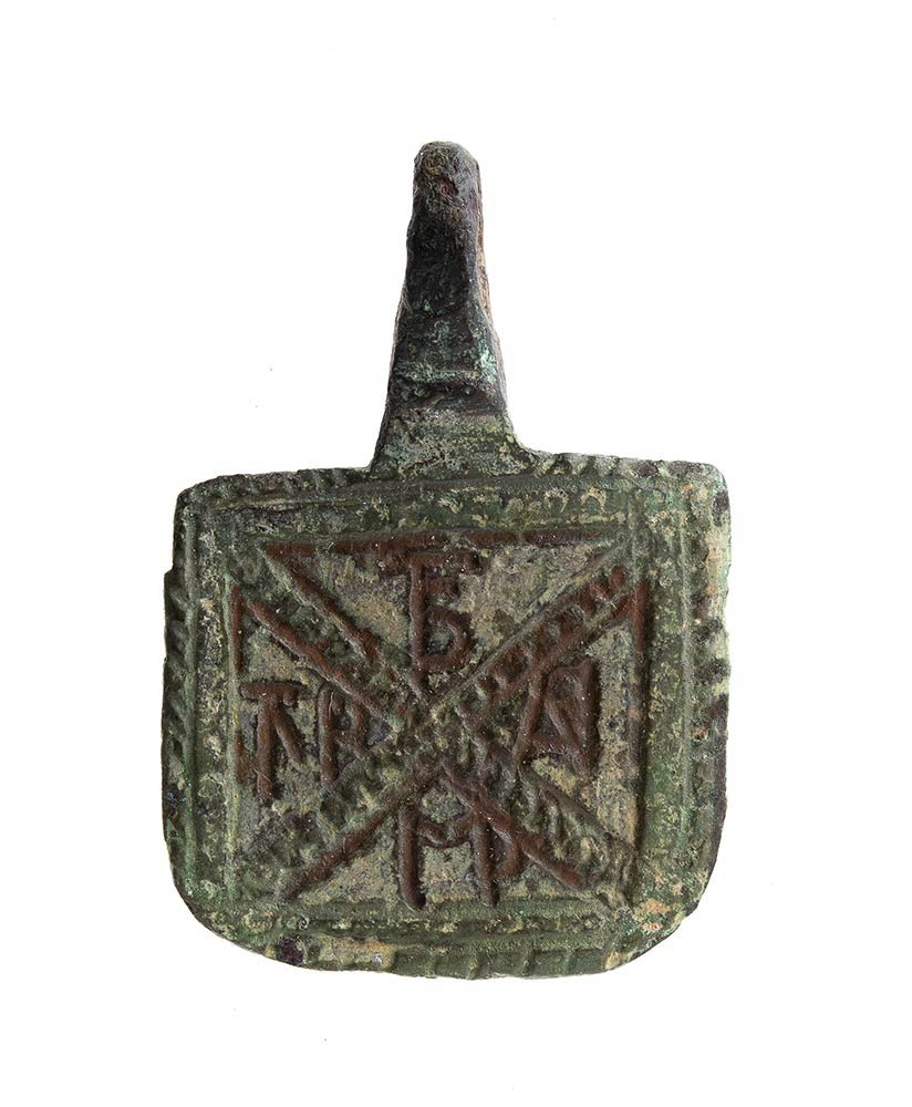 Paleochristian Bronze Pendant, 4th - 8th century; height cm 3,5, length cm 2,4; Decorated with the St. Andrew's Cross and latin monograms. Provenance: English private collection, bought before 2000s.