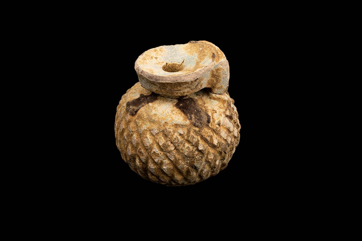 Egyptian Faience Aryballos, Late Period, Dynasty XXV-XXVI, 712 - 525 BC; height cm 6. Provenance: Collection returned by the German Judicial Authority to Herakles Numismatik und Antiquitäten GmbH (München), who acquired it on the European art market since the 1970s; from 2000s the entire collection is located in the United Kingdom; some objects of this collection were bought subsequently by the Italian Government (e.g.: bari.repubblica.it - Archeologia, torna in Puglia la stele dauna di oltre 2.500 anni fa: presa all'asta con una colletta). Almost all objects need restoration, if well executed will be an excellent investment, also a good exercise for scientific or academic purposes. Lot sold as seen, no returns.