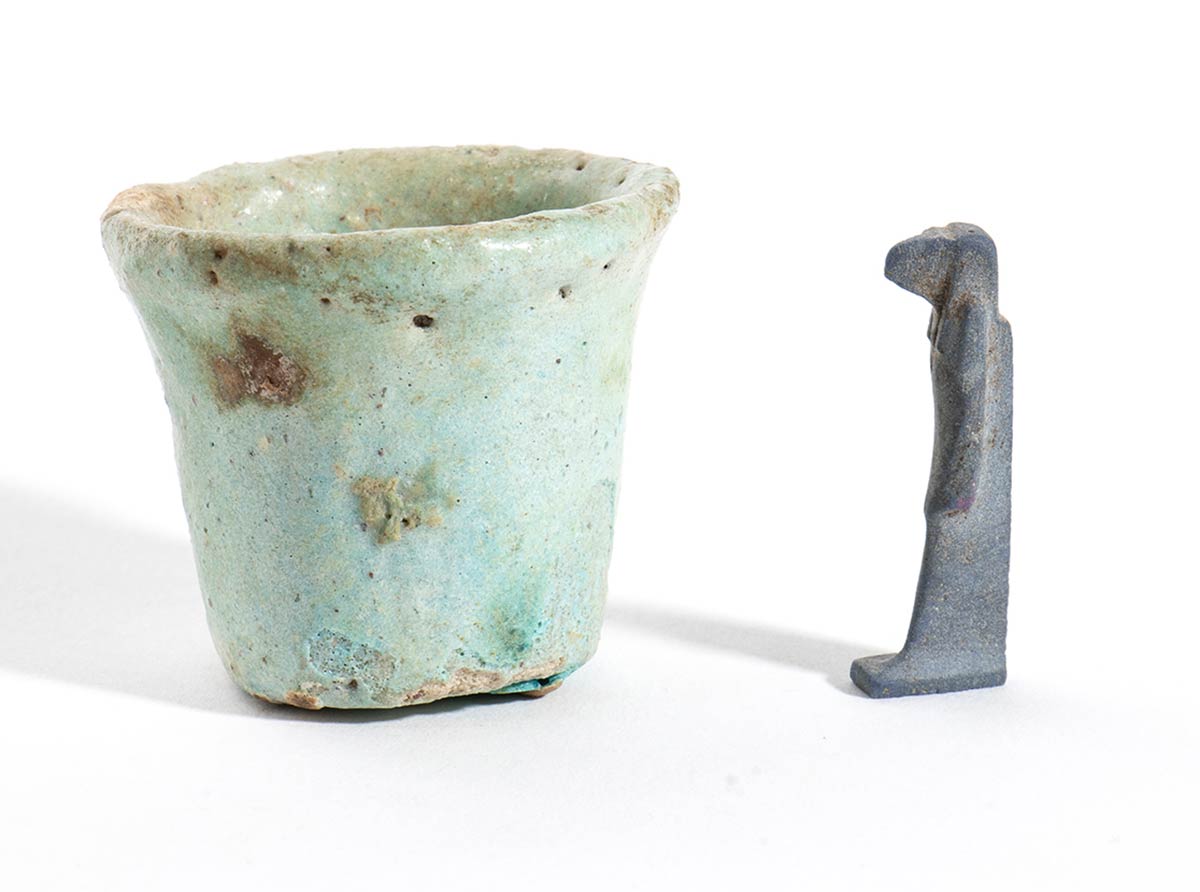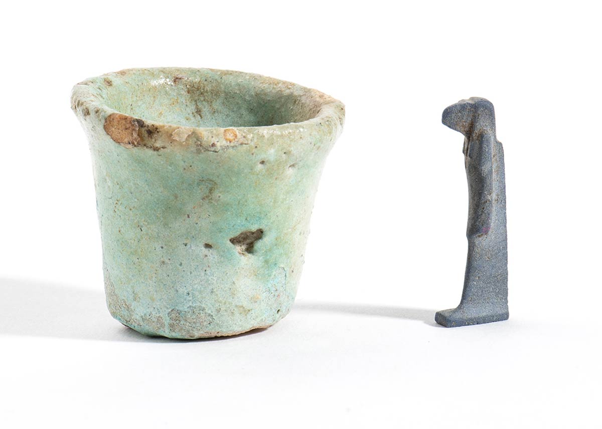 Couple of Egyptian Faience Items, Late Period, 664 - 332 BC; height cm 3,2 - diam. cm 3,6; A miniature vessel and an amulet in the shape of Thoth. Provenance: English private collection.