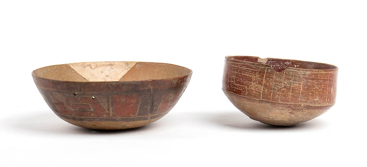 Couple of Bowls, Mexico, Nayarita Area, 4th century BC - 4th century AD; height max cm 6,8; diam. max cm 17; One bowl is characterized by a richly polichromy, suspension holes and restorations; the other one is characterized by geometric pattern and a small lack on the rim. Provenance: From an Italian collection formed during 1970s - 1990s; this lot require the Italian export licence (please contact the auction house about info and additional cost).