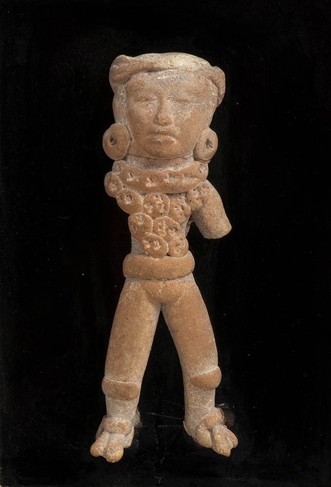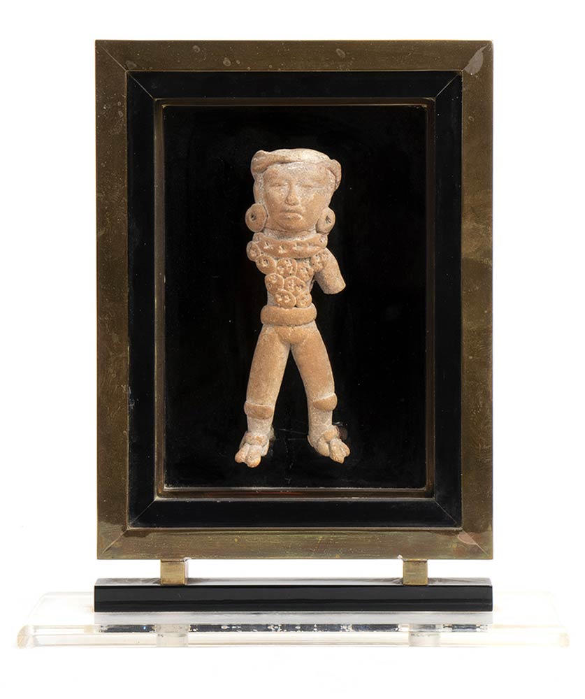 Terracotta Figure of a Sciaman, Mexico, Aztec Culture, ca. 14th - 16th century; height cm 15,5, frame cm 24,8x18,8; inserted in a frame, the figure seems to be suspended in a mysterious space. Provenance: From an Italian collection formed during 1970s - 1990s; this lot require the Italian export licence (please contact the auction house about info and additional cost).