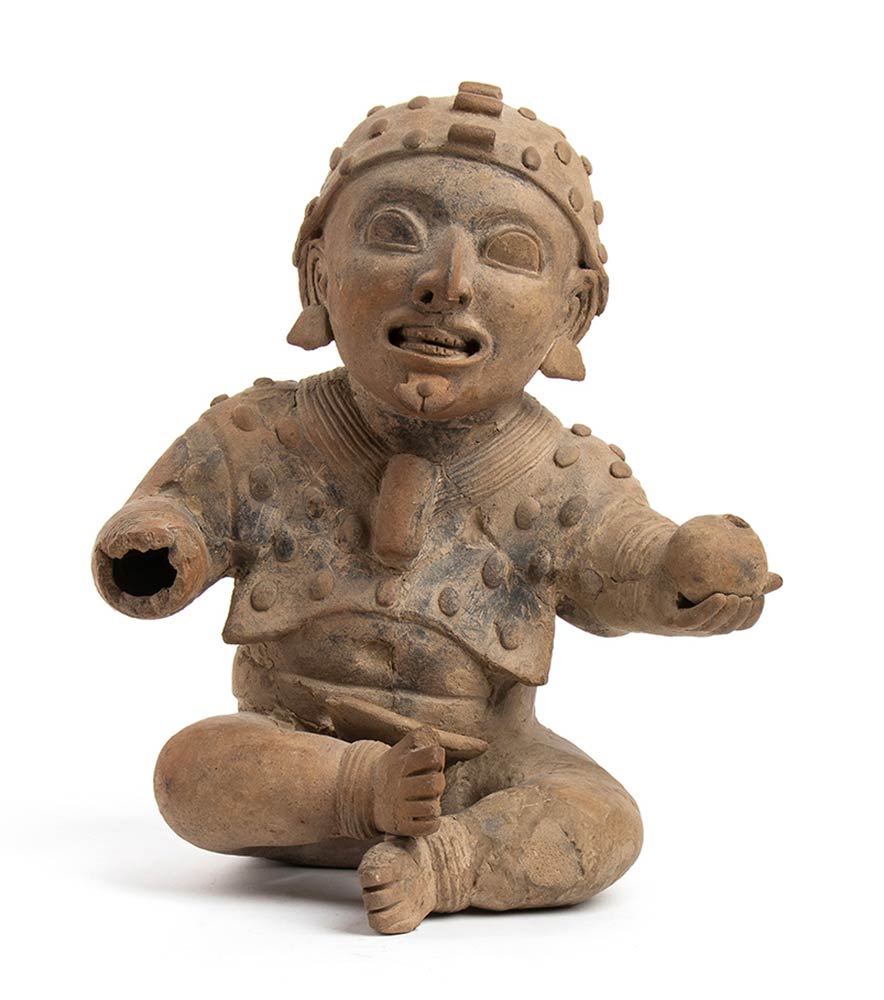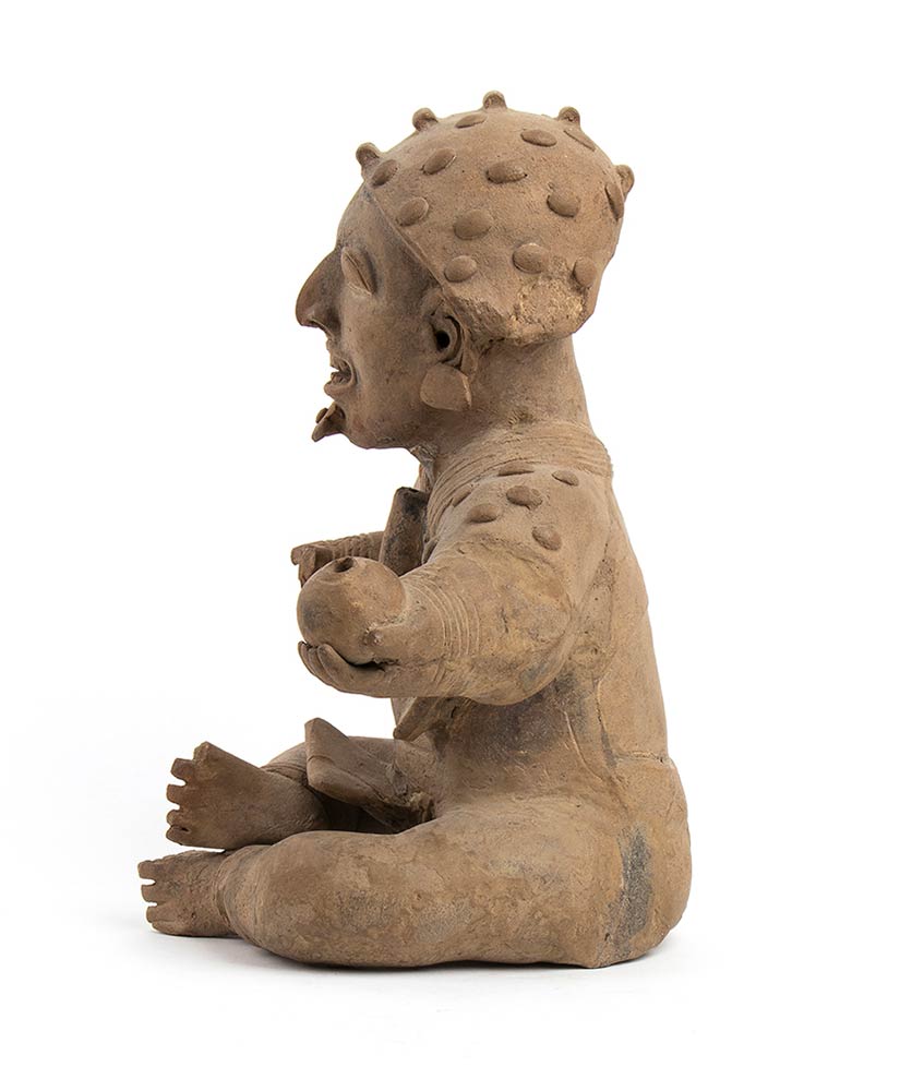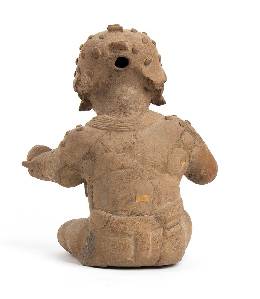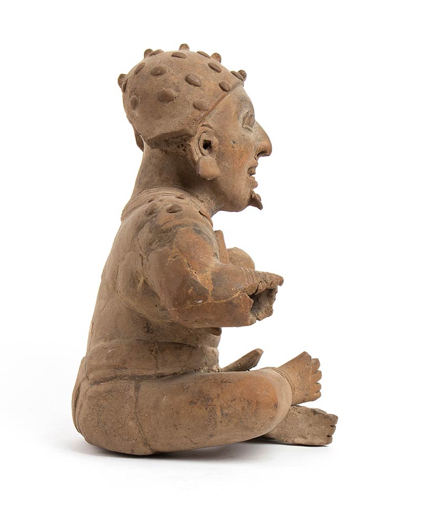 Terracotta Statuette of a Dignitary, Ecuador, Jama-Coaque Culture, ca. 6th - 12th century AD; height cm 30; Restoration and a missing arm. Provenance: From an Italian collection formed during 1970s - 1990s; this lot require the Italian export licence (please contact the auction house about info and additional cost).