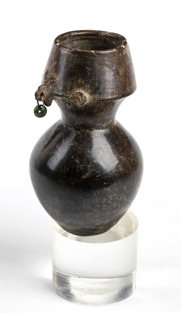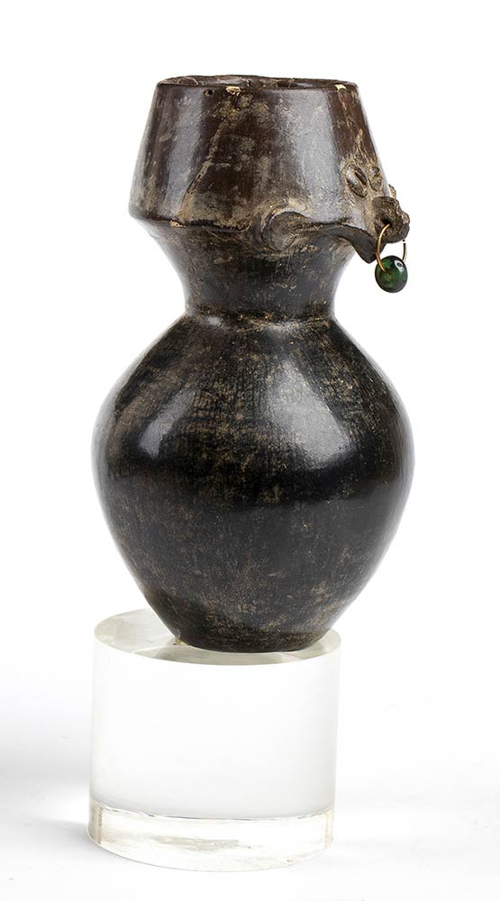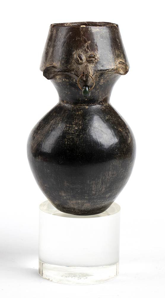 Antropomorphic Jar, Colombia, Tairona Culture, ca. AD 1000 – 1500; height cm 16; diam. cm 5,7; Covered by a bright, shiny dark brown engobe, obtained from a paint rich in iron. Shaped with strongly stylized manner, with on nose a gold-tumbaga ring with jade as pendant. Restorations on the rim; with a plexiglass stand. Provenance: From an Italian collection formed during 1970s - 1990s; this lot require the Italian export licence (please contact the auction house about info and additional cost).