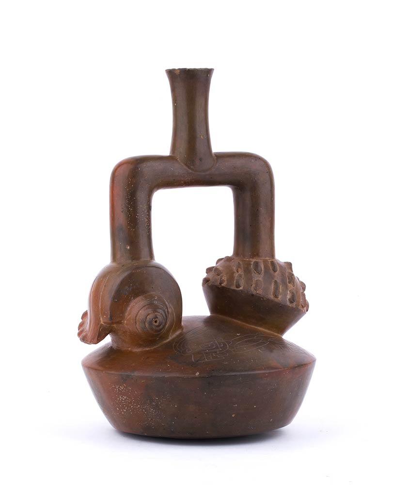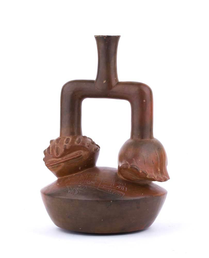 Stirrup-spouted bulbous bottle, Peru, Chavin Culture, ca. 7th century BC; height cm 27,2. Provenance: From the Marino Taini collection, Milan; this lot is sold with an export licence issued by the Republic of Italy.