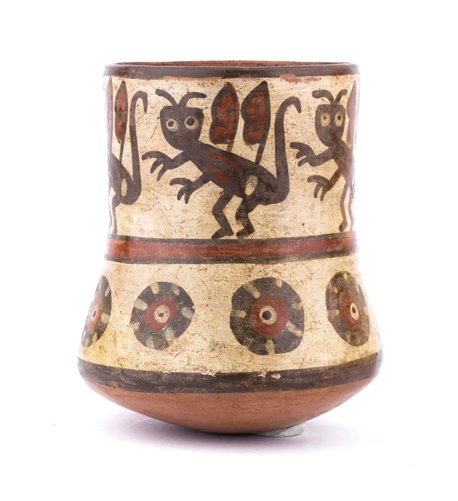 Polychrome ritual beaker, Peru, Nazca Culture, ca. 2nd - 6th century AD; height cm 12. Provenance: From the Marino Taini collection, Milan; this lot is sold with an export licence issued by the Republic of Italy.