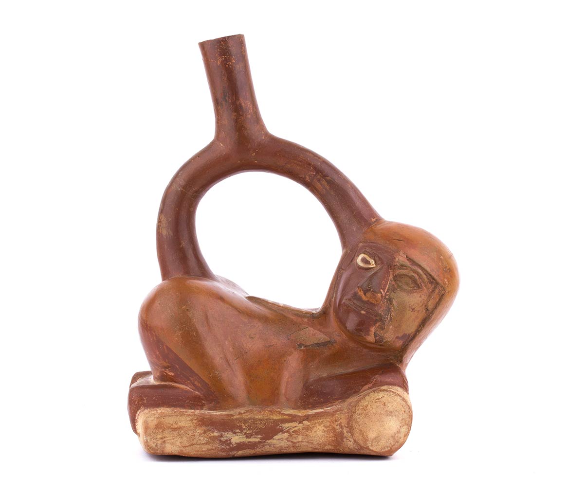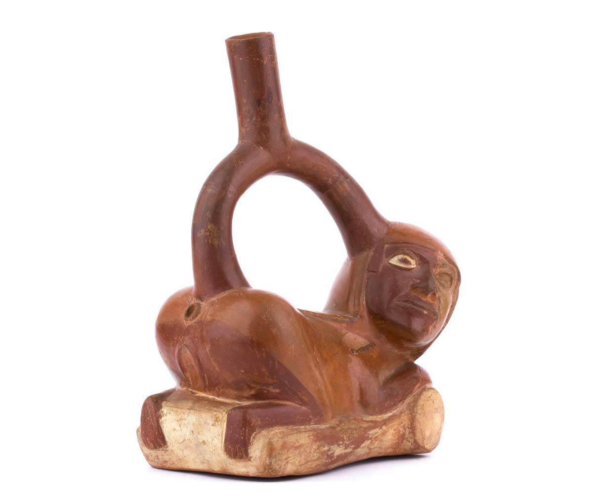 Female stirrup-spouted bottle, Peru, Moche Culture, ca. 4th - 6th century AD; height cm 24,5. Provenance: From the Marino Taini collection, Milan; this lot is sold with an export licence issued by the Republic of Italy.
