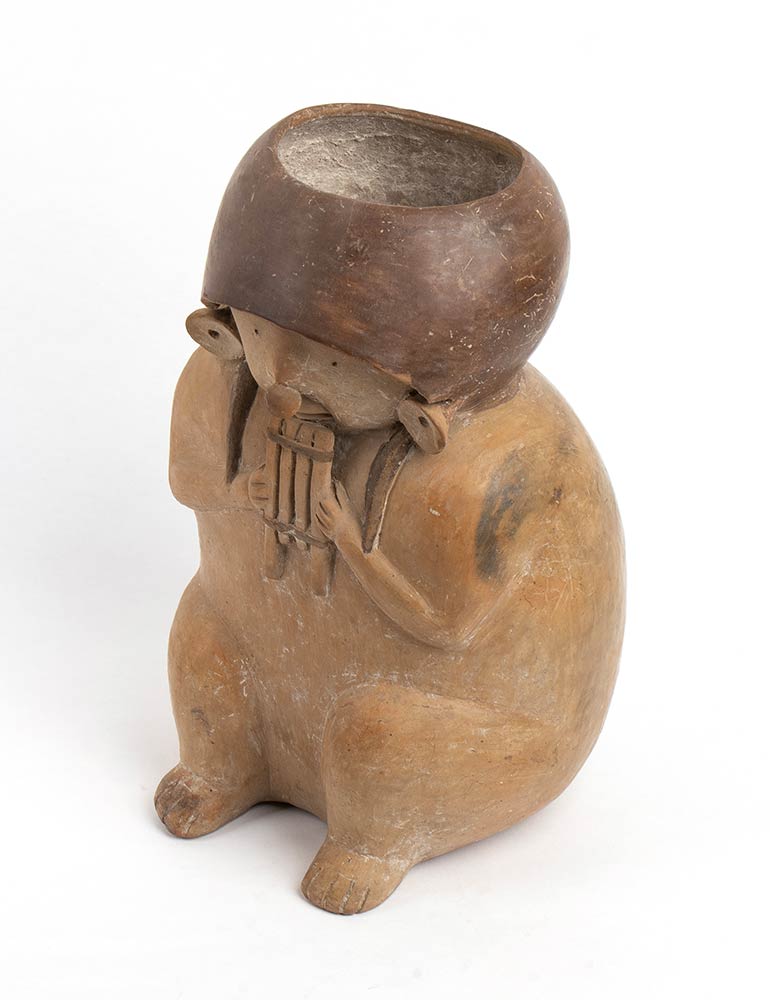 Jar in the shape of a Musician playing pan pipe, Perù, Chancay Culture, ca. 11th - 14th century; height cm 28, diam. cm 9,5. Provenance: From an Italian collection formed during 1970s - 1990s; this lot require the Italian export licence (please contact the auction house about info and additional cost).