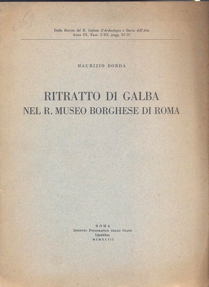 BORDA M. - Ritratto di Galba nel R. Museo Borgese di Roma. Roma, 1943. pp. 13, con illustrazioni nel testo. brossura editoriale, buono stato, raro e importante.