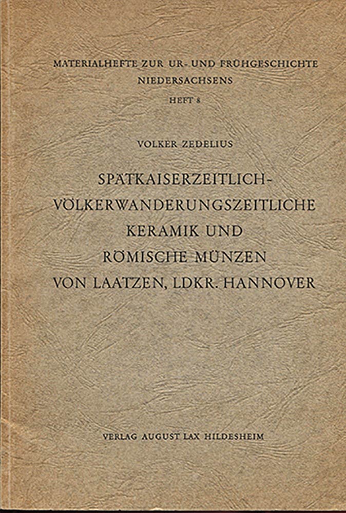 ZEDELIUS V. - Spatkaiserzeitlich- volkerwanrungszeitliche keramik und romische munzen von laatzen, ldkr, Hannover. Hildesheim, 1974. pp. 56, tavv. 9, + 1 mappa. ril. editoriale, buono stato, raro e importante per la monetazione romano-barbarica.<br>
