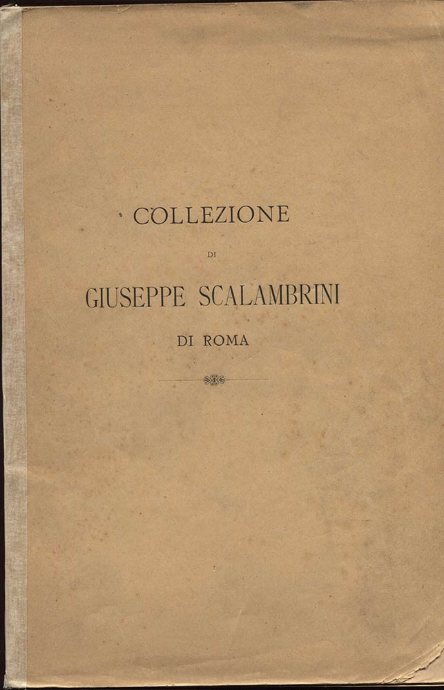 CAPOBIANCHI V. – Catalogo della collezione Scalambrini di Roma. Antichità greche e romane, sculture in marmi, mosaici, bronzi, terrecotte, vetri intagli, camei e medaglie. Sculture del Rinascimento, majoliche, bronzi, ferri. Ecc. Roma, 20 – Febbraio, 1888. Pp. 145, nn. 1494, tavv. 10. Ril. ed. sciupata, buono stato, importante e raro.