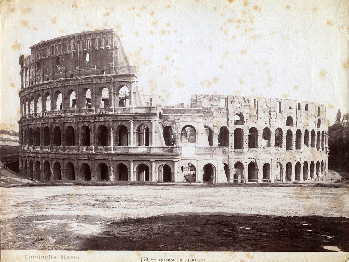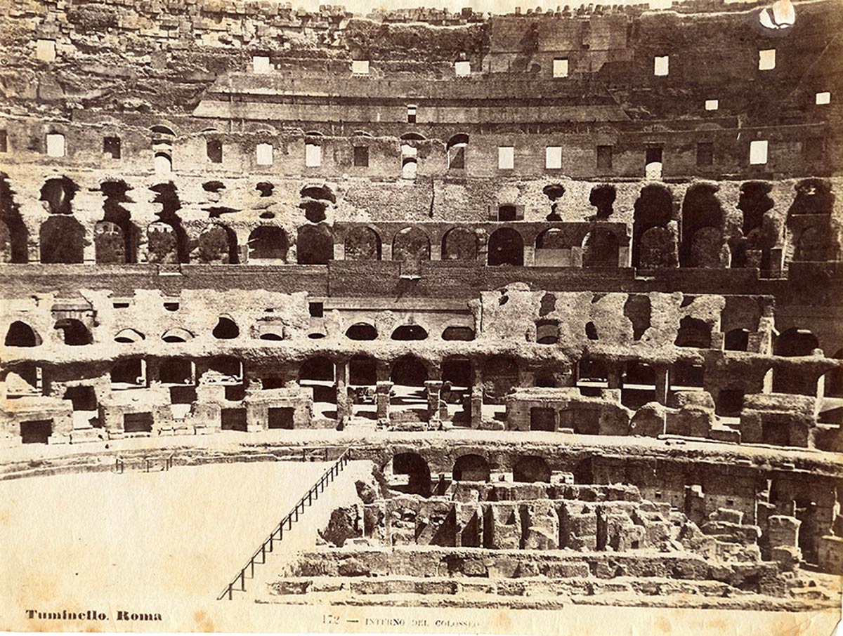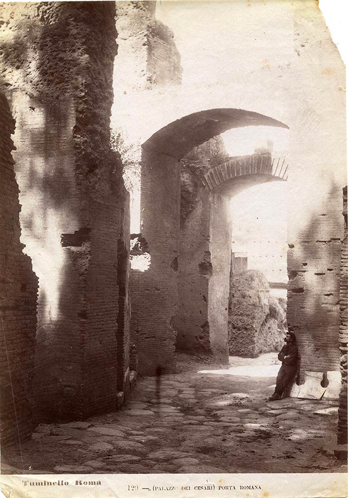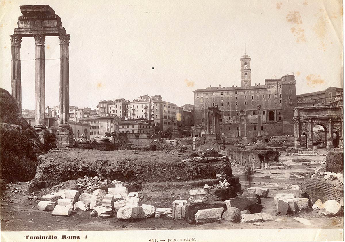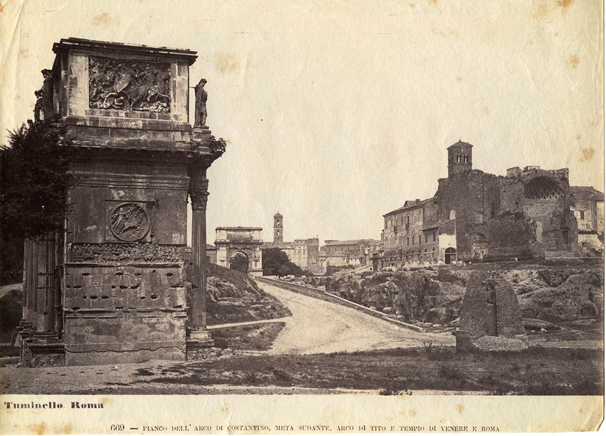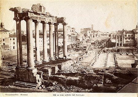 Collection of 16 photographs of Roman Archaeological Ruins, taken by Lodovico Tuminello between 1870 - 1890; various sizes, ca. cm 19 x 25 each; Photographs taken by Lodovico Tuminello, famous photographer and hero of the Roman Republic (1849), active until 1900 in Via Dei Condotti 21. The selection includes 16 albumen prints with reinforcement treatmnent process (Crozat type) and made on dedicated paper, some of which with an unidentified watermark. Description of the places, header of the photgrapher and serial number printed on the lower edge. In these pictures some famous views of Rome: the Meta Sudans, the Roman Forum still in the demolition area of Rione Monti, Ponte Nomentano inserted in a beautiful Roman Campagna. The presence of human figures in the views as an element of proportion of the spaces. Prints never applied to the cardboard. Some small cuts and small missed parts, generally very good condition, and an impressive sharpness.