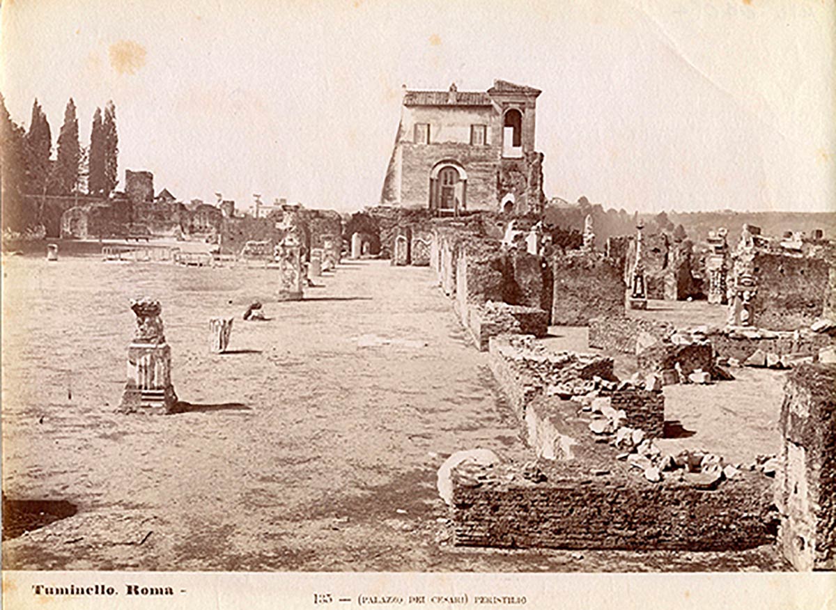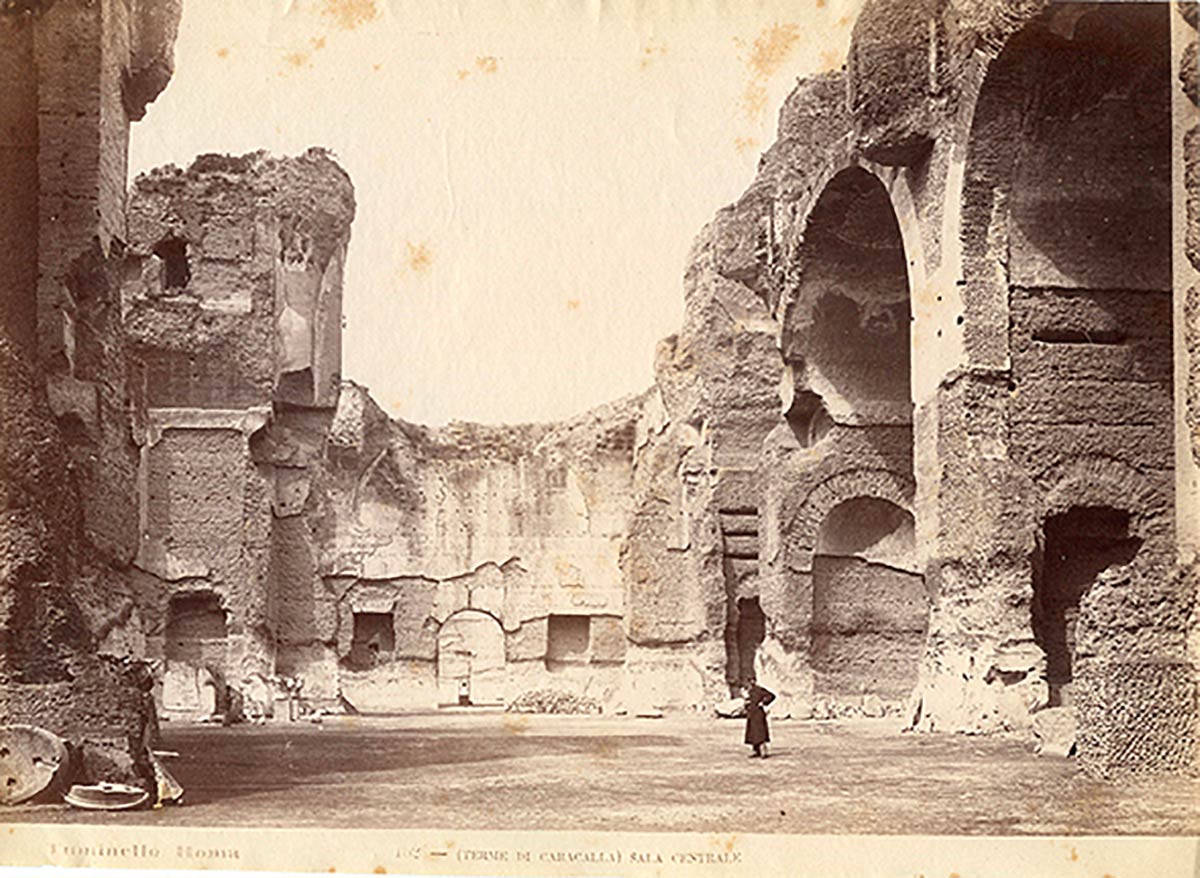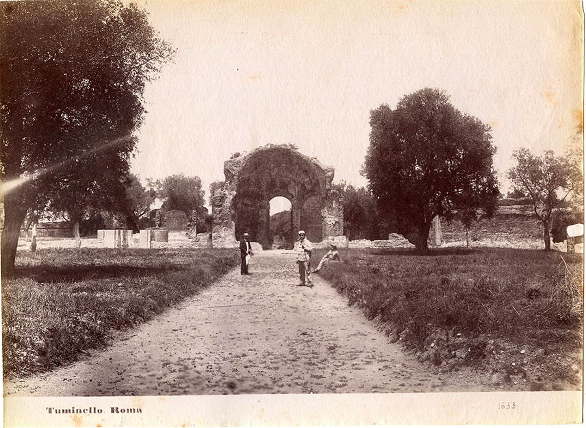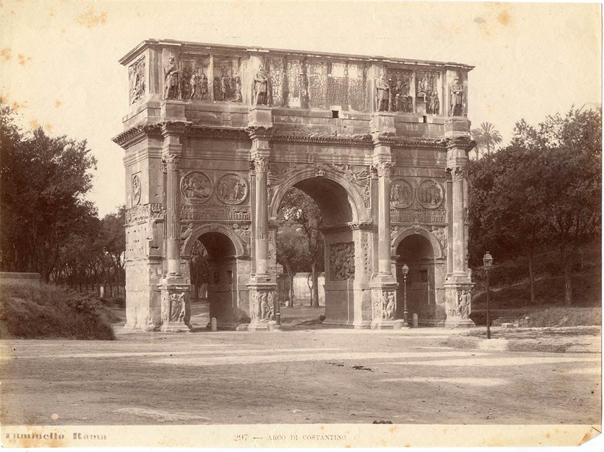 Collection of 16 photographs of Roman Archaeological Ruins, taken by Lodovico Tuminello between 1870 - 1890; various sizes, ca. cm 19 x 25 each; Photographs taken by Lodovico Tuminello, famous photographer and hero of the Roman Republic (1849), active until 1900 in Via Dei Condotti 21. The selection includes 16 albumen prints with reinforcement treatmnent process (Crozat type) and made on dedicated paper, some of which with an unidentified watermark. Description of the places, header of the photgrapher and serial number printed on the lower edge. In these pictures some famous views of Rome: the Meta Sudans, the Roman Forum still in the demolition area of Rione Monti, Ponte Nomentano inserted in a beautiful Roman Campagna. The presence of human figures in the views as an element of proportion of the spaces. Prints never applied to the cardboard. Some small cuts and small missed parts, generally very good condition, and an impressive sharpness.