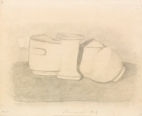 GIORGIO MORANDI 1890 - 1964 NATURA MORTA signed and dated 1943, pencil on paper firmato e datato 1943 matita su carta cm 23,5x29 PROVENANCE Galleria del Milione, Milano Collezione L. Pomini, Castellanza Casa dell'Arte, Sasso Marconi Ivi acquistato dall'attuale proprietario negli anni Settanta EXHIBITED Sasso Marconi, La Casa dell'Arte, Protagonisti, 1977, illustrato Bologna, La Casa dell'Arte, 1978, illustrato Ferrara, Palazzo dei Diamanti, Giorgio Morandi, 1978, n. 5, illustrato Sasso Marconi, La Casa dell'Arte, Giorgio Morandi, 1981, pag. 16, illustrato Bolzano, Castel Mareccio, Giorgio Morandi, 1988, n. 33, illustrato LETTERATURA E. Tavoni, Morandi. Disegni, vol. I, Milano 1981, n. 67, illustrato E. Tavoni, Morandi. Disegni. Catalogo generale, Milano 1994, n. 1943 6, pag. 75, illustrato