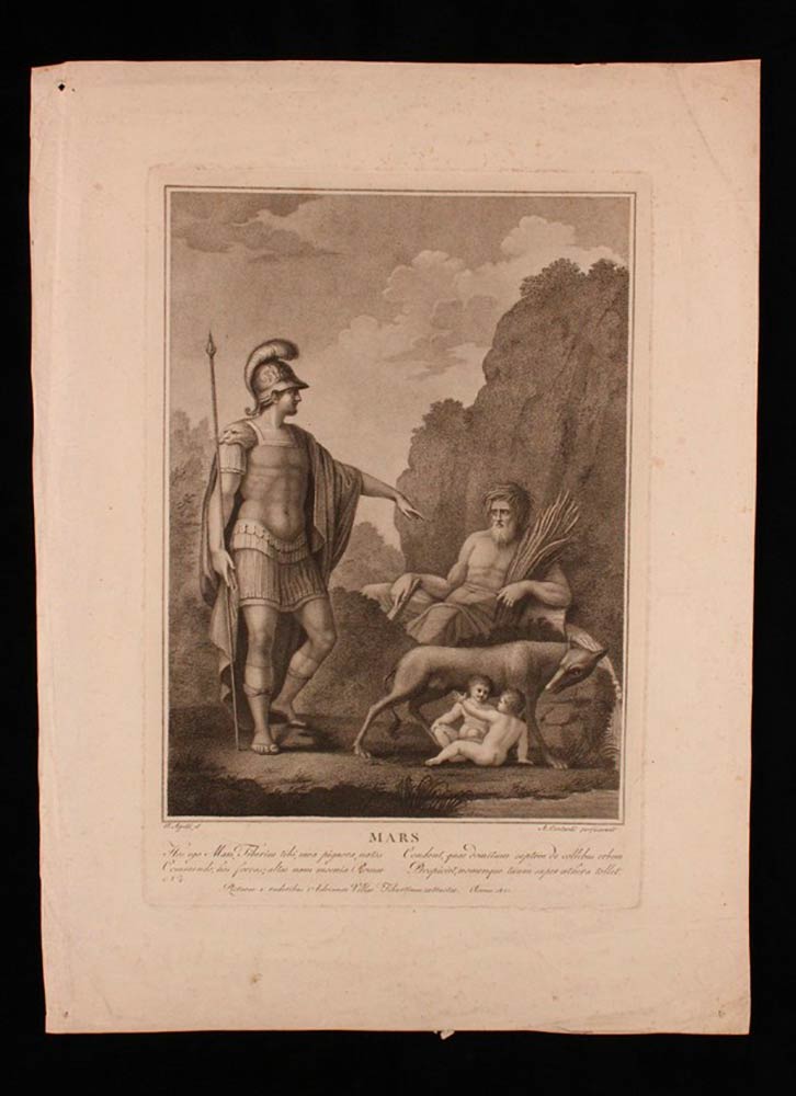 Marte, il Tevere e i gemelli di Roma, 1801; Incisione a pointillé di Alessandro Contardi (1795-1822) su disegno di Paolo Agelli (1778 -1841) tratta dagli affreschi di Villa Adriana a Tivoli, stampata nel 1801 ca. a Roma