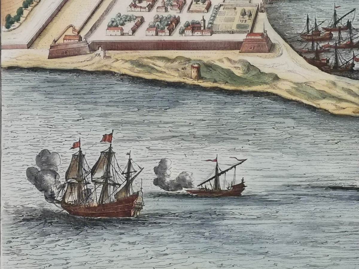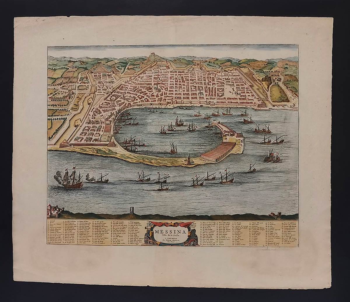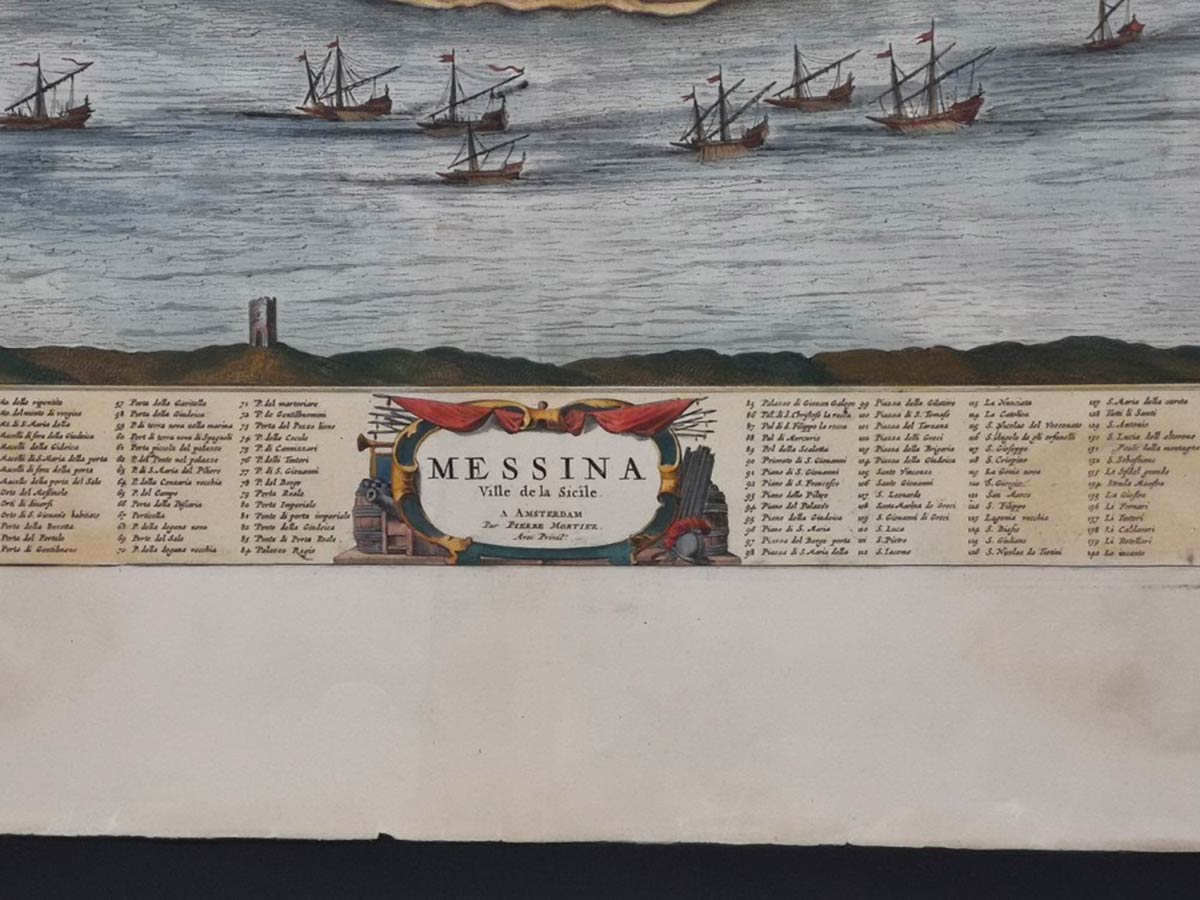Messina – pianta, 1705; Acquaforte di Pierre Mortier (1661-1711), con veduta del porto animata da numerosi velieri. Tratta da Nouveau Theatre d'Italie, incisa da Joan Blaeu e pubblicata postuma da Pierre Mortier, 1705 – Amsterdam