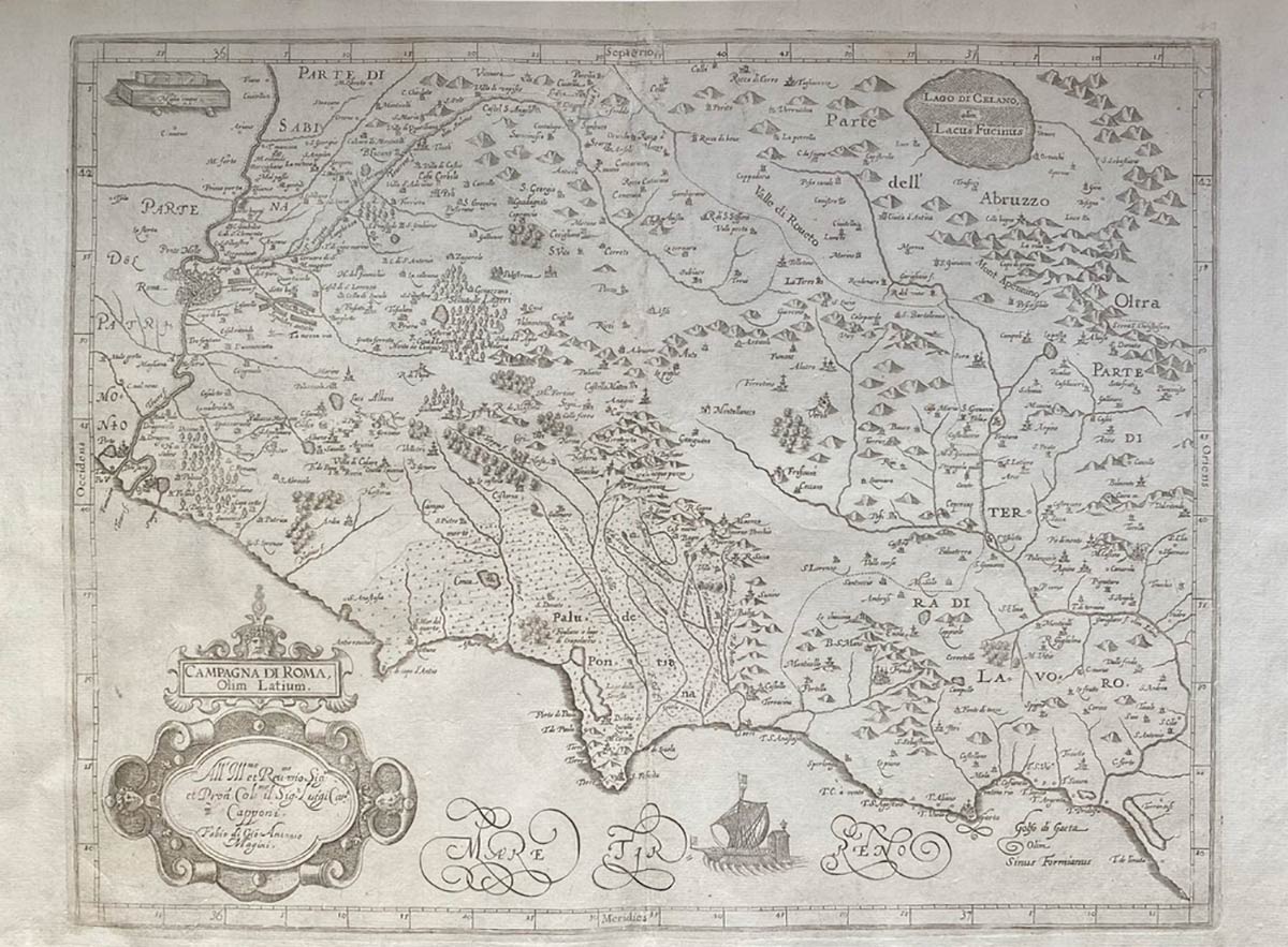 Incisione in rame raffigurante la Campagna di Roma. Facente parte dell’atlante realizzato alla fine del 500 dal geografo Giovanni Antonio Magini. L’atlante fu pubblicato nel 1620 da figlio Fabio.