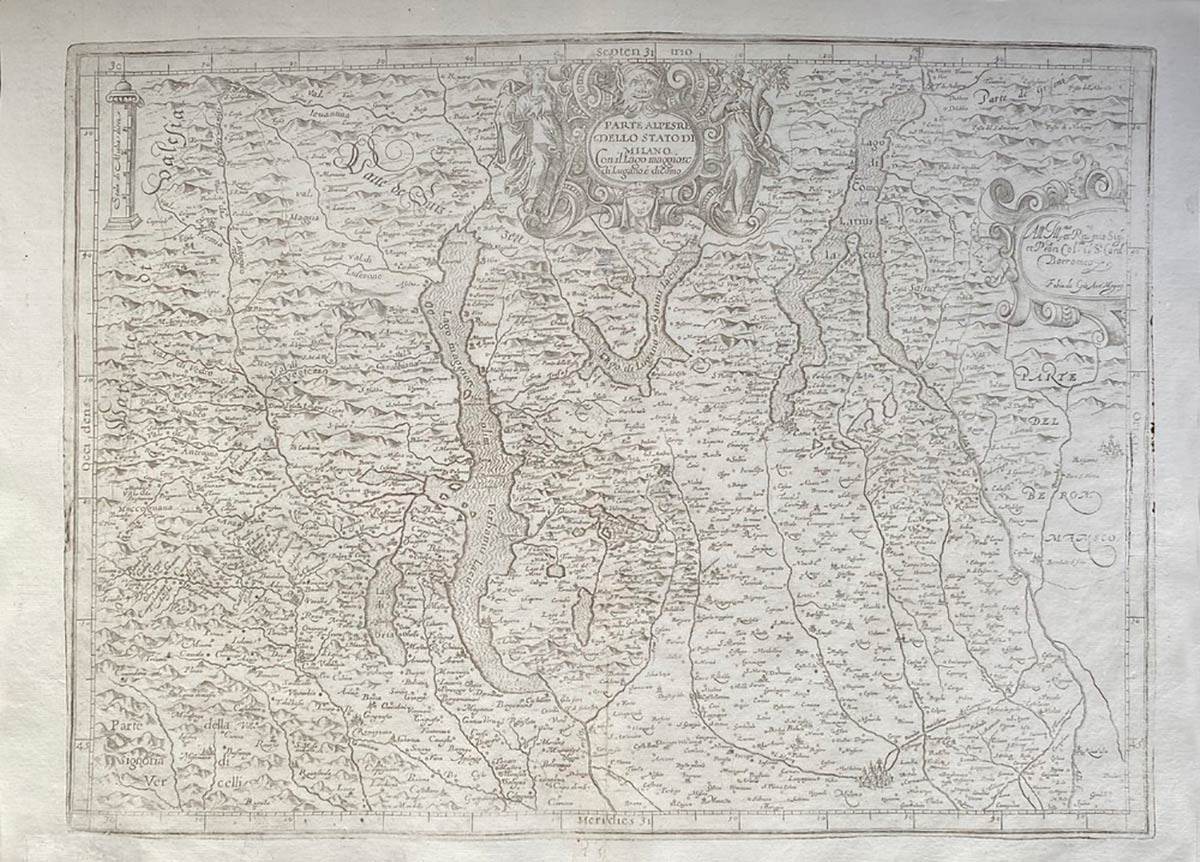 Incisione in rame raffigurante La parte alpestre del territorio di Milano. Facente parte dell’atlante realizzato alla fine del 500 dal geografo Giovanni Antonio Magini. L’atlante fu pubblicato nel 1620 da figlio Fabio.