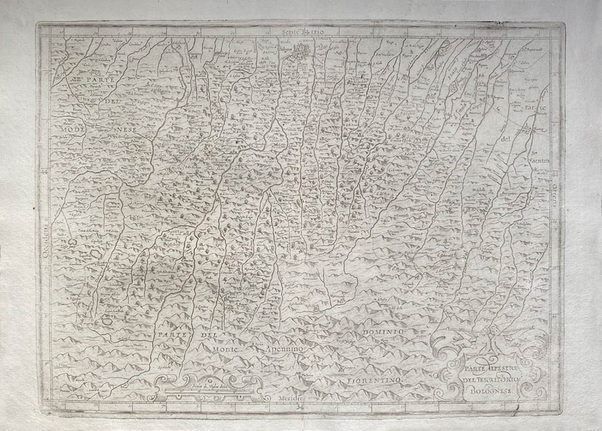 Incisione in rame raffigurante la Parte alpestre del territorio bolognese. Facente parte dell’atlante realizzato alla fine del 500 dal geografo Giovanni Antonio Magini. L’atlante fu pubblicato nel 1620 da figlio Fabio.