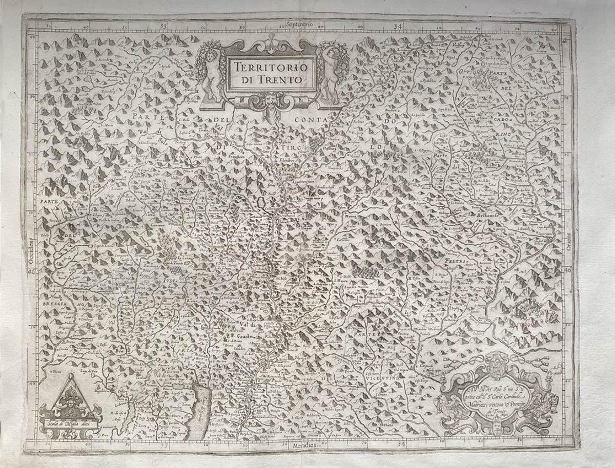 Incisione in rame raffigurante il Territorio di Trento. Facente parte dell’atlante realizzato alla fine del 500 dal geografo Giovanni Antonio Magini. L’atlante fu pubblicato nel 1620 da figlio Fabio.