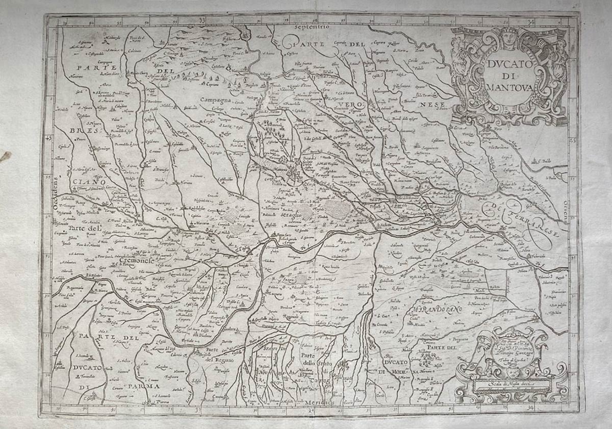 Incisione in rame raffigurante il Territorio di Mantova. Facente parte dell’atlante realizzato alla fine del 500 dal geografo Giovanni Antonio Magini. L’atlante fu pubblicato nel 1620 da figlio Fabio.