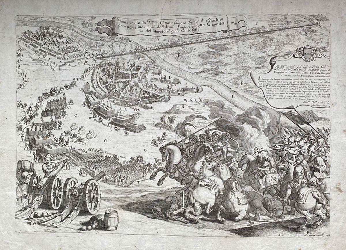 PIANTA ET ALZATA DELLA CITTÀ E FAMOSO PONTE D’ESSECH, IN GRAN PARTE INCENDIATO DALL’ARMI IMPERIALI SOTTO LA CONDOTTA DEL MARESCIALLO GNLE CONTE LESLÈ