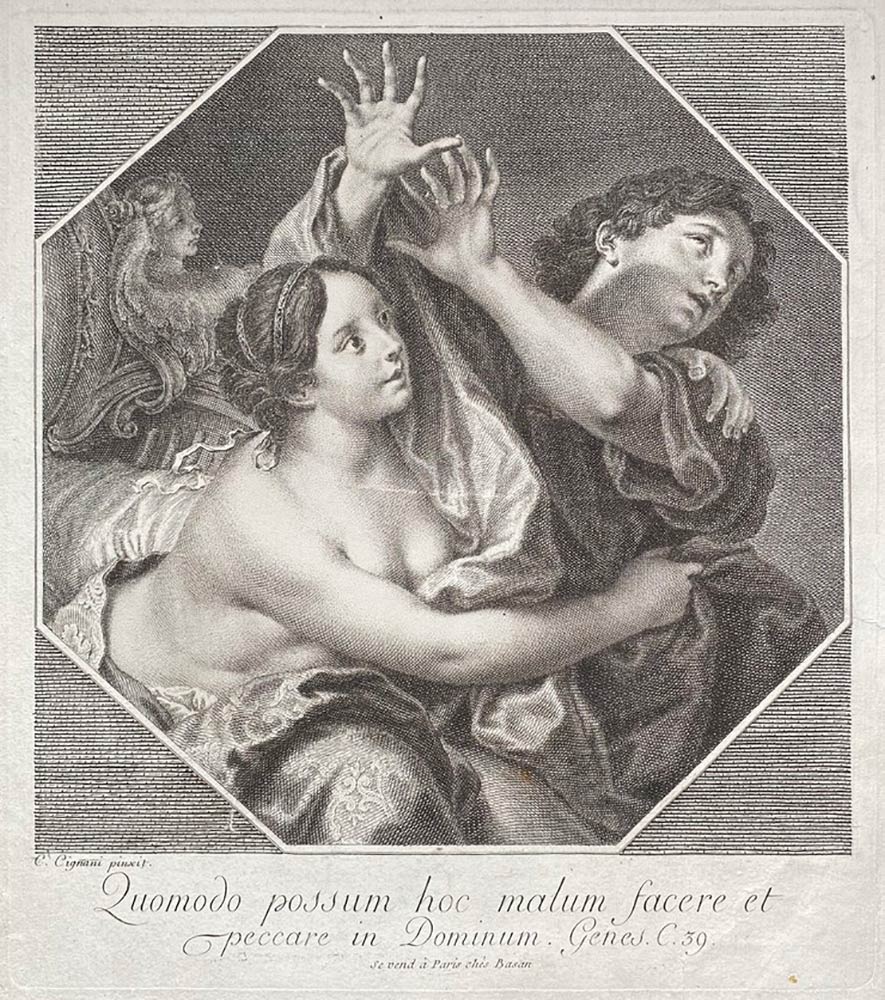 L’incisione tratta da un dipinto di Cignani, conservato alla Gemaldegalerie di Dresda, mostra la scena biblica di Giuseppe sedotto dalla moglie di Putifarre.