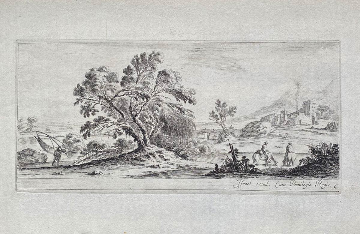 Pescatore con rete a sinistra, albero al centro, due cavalieri a destra.
