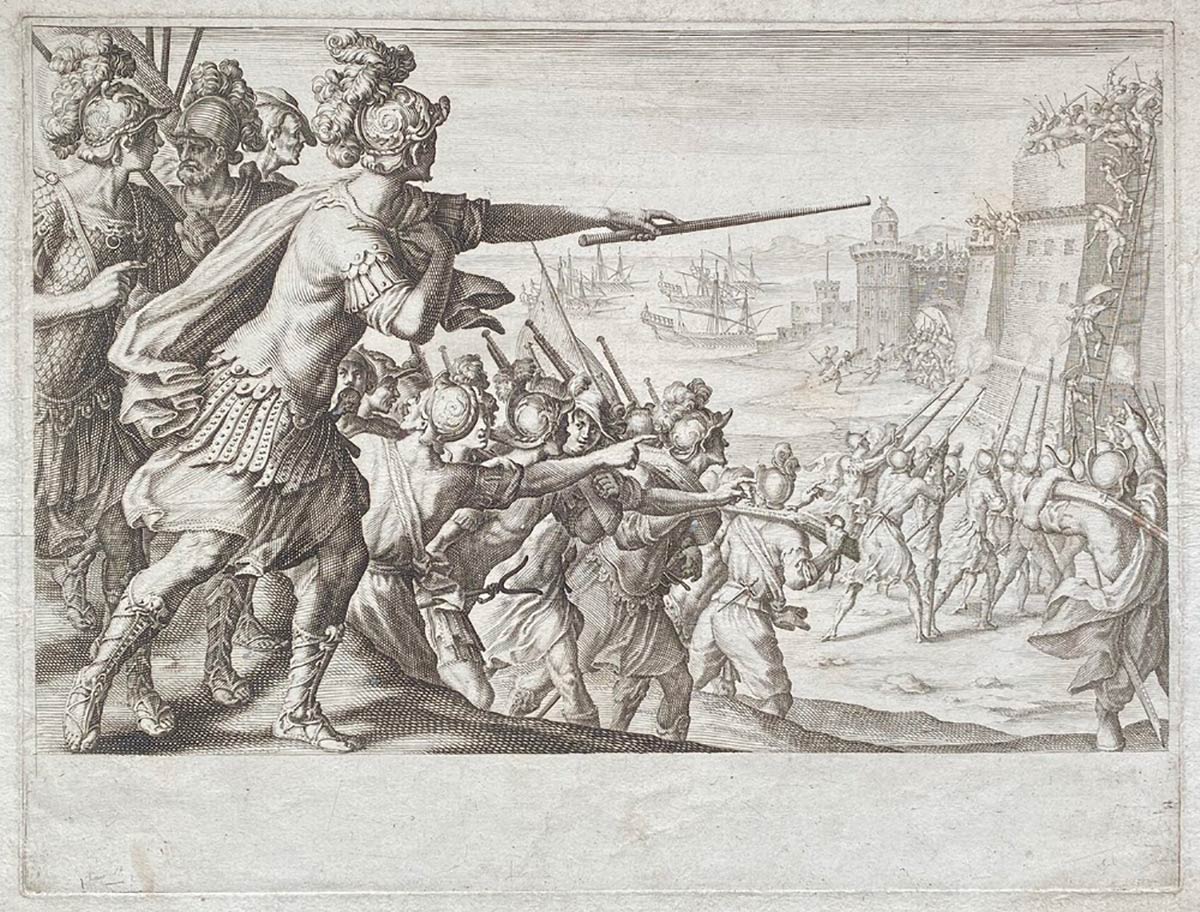 Scena di assedio con armati vestiti in abiti antichi, la battaglia si svolse nel settembre 1608. Tiratura del XVIII secolo.